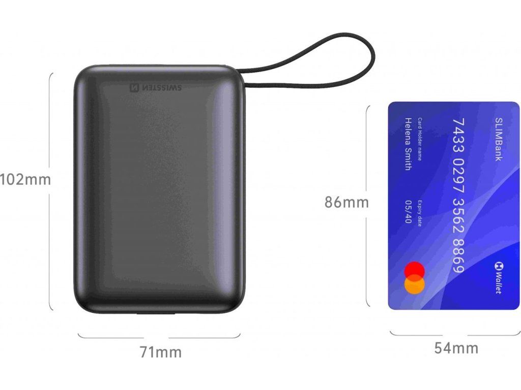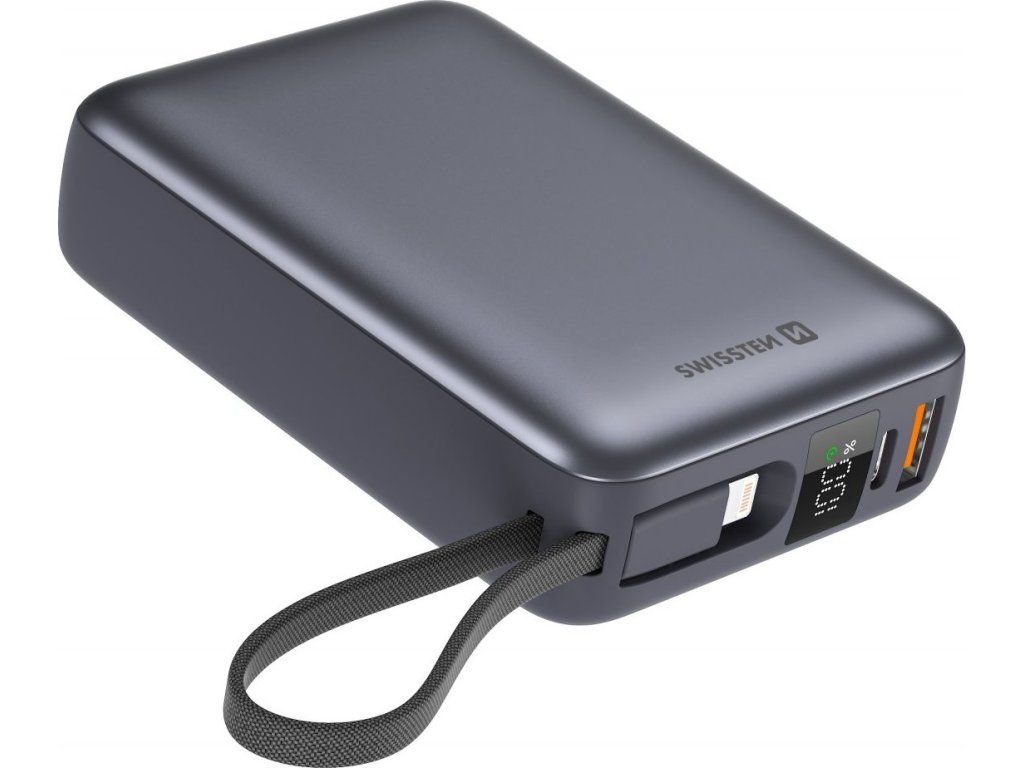 Powerbanka Swissten 20000 mAh s integrovanými kabely USB-C + Lightning, Výstupní porty: USB-A + USB-C, Max. výkon 22.5W, Váha: 323 g, Typ baterie: Li-Polymer, Malé rozměry: (10.2 x 7.1 x 2.9 cm). Baleno v blistru Swissten.