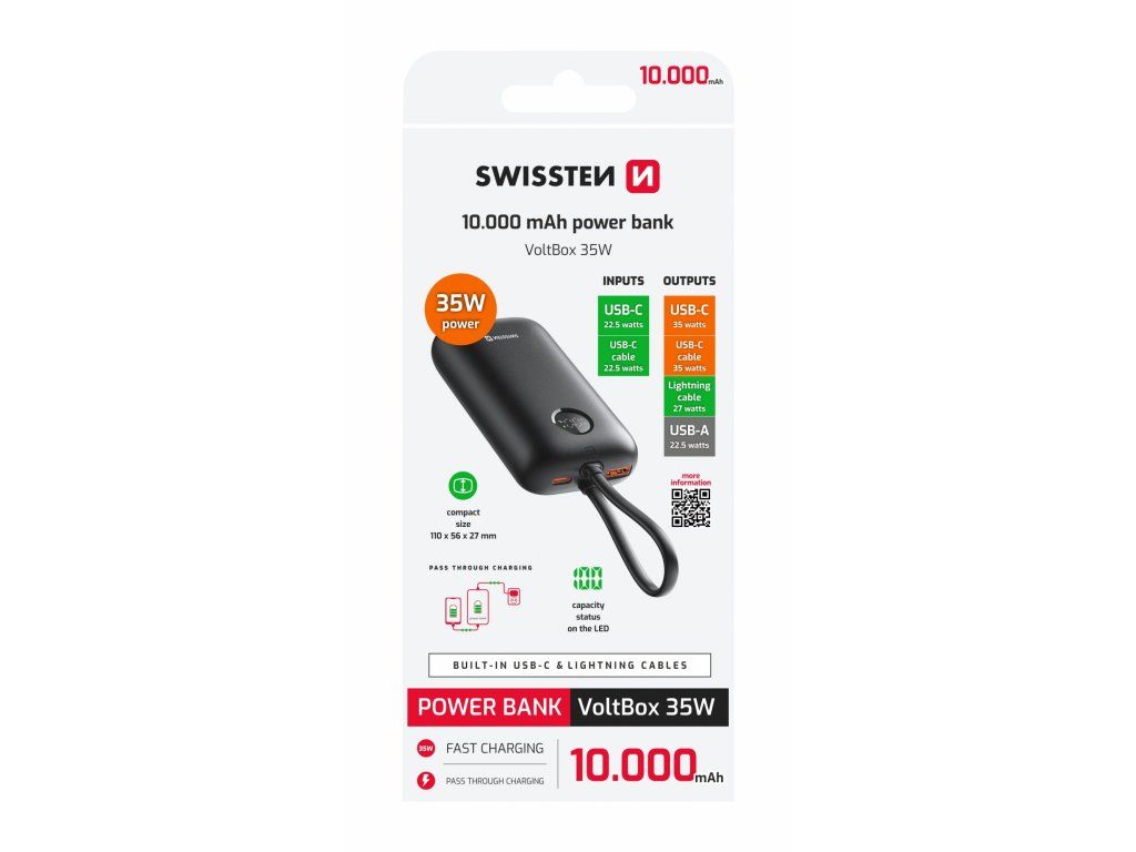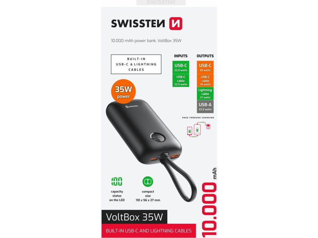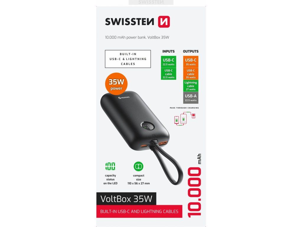 Powerbanka Swissten Voltbox 10000 mAh, Kabely USB-C + Lightning kabely, Porty výstupu: USB-C + USB-A, Max. výkon 35W, Váha: 196 g, Typ baterie: Li-Ion, Malé rozměry: (11 x 5,6 x 2,7 cm). Baleno v blistru Swissten.