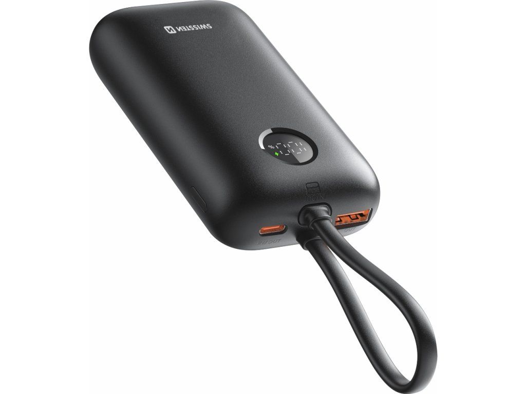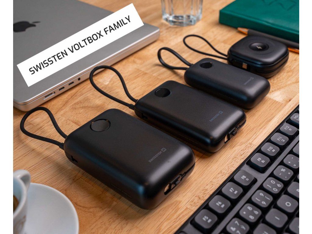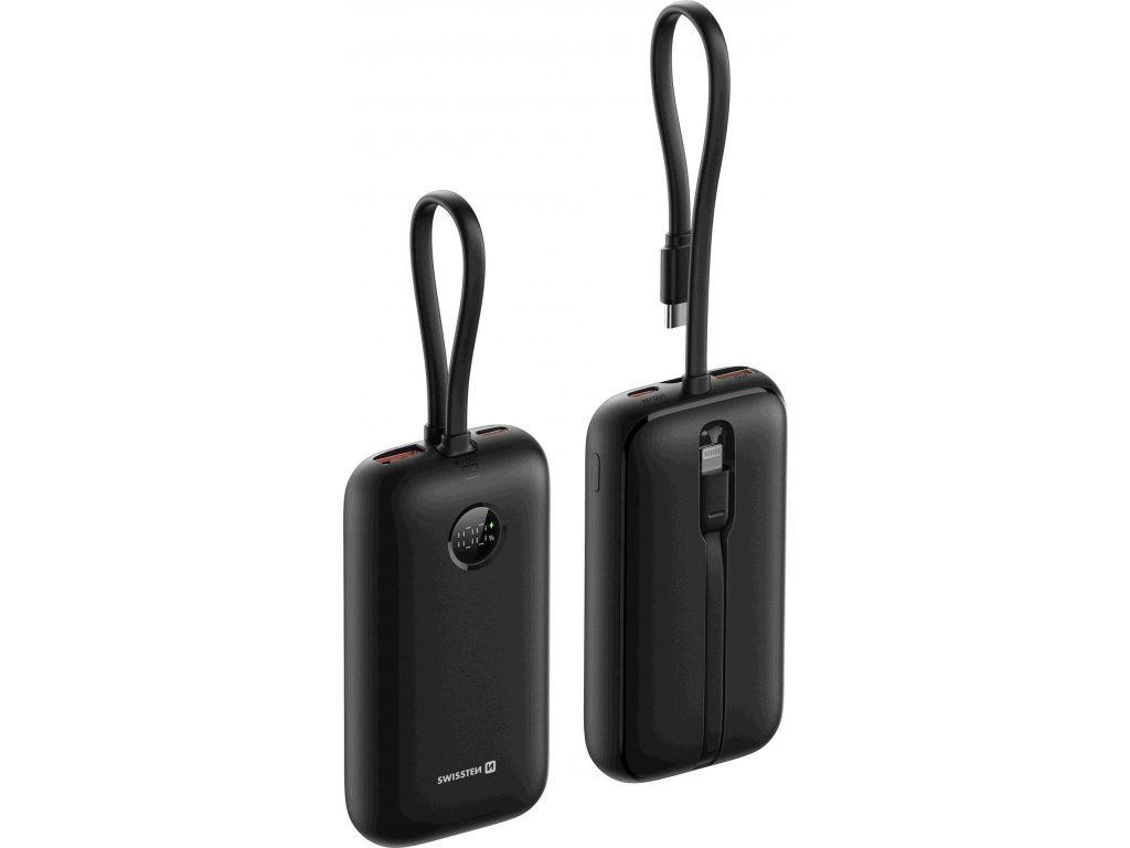 SWISSTEN POWER BANK VOLTBOX 35W 10000 mAh S INTEGROVANÝMI KABELY USB-C A LIGHTNING ČERNÁ
