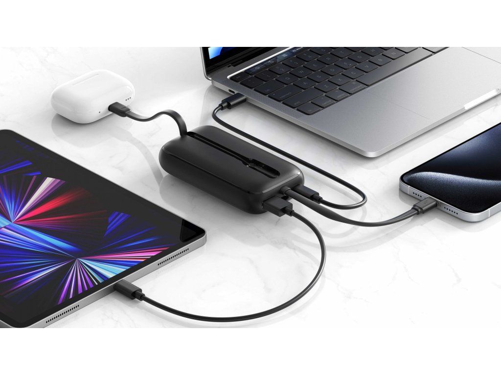 Vestavěné kabely USB-C a Lightning poskytují maximální flexibilitu a pohodlí, což umožňuje nabíjet zařízení se systémem Android i iOS bez nutnosti nosit další příslušenství. K dispozici je také port USB-A s výkonem až 22,5 W pro nabíjení dalších zařízení.