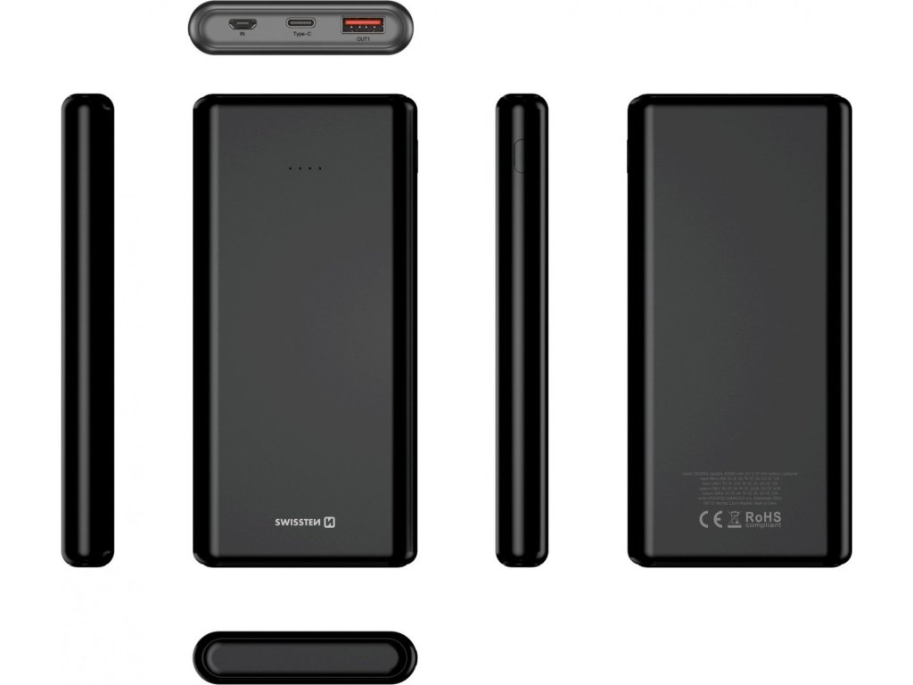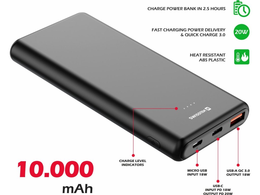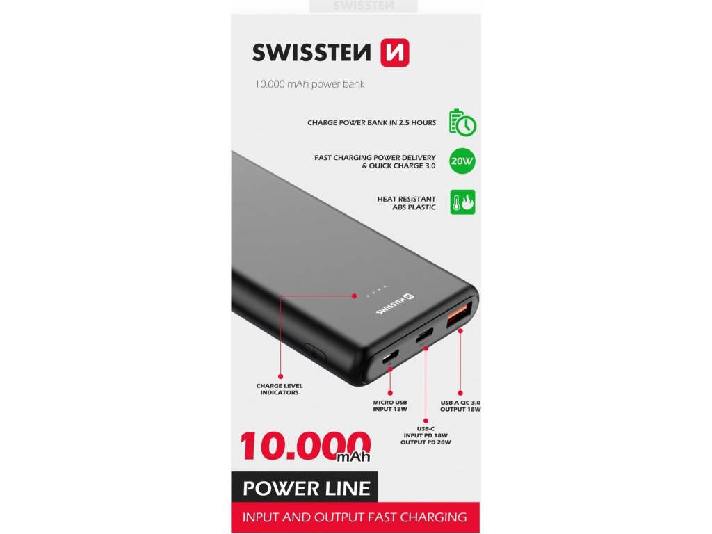 Powerbanka SWISSTEN s kapacitou 10.000 mAh se vstupy microUSB, USB-C a výstupy USB-A, USB-C a rychlým dobíjením PD i QC. Baleno v blistru SWISSTEN.
