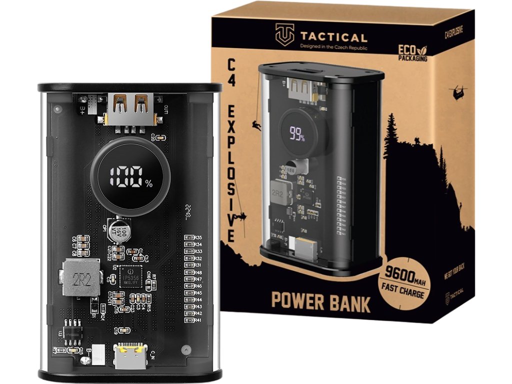 Externí zdroj energie pro Tvoje expedice a cestování. Dobij svůj telefon, tablet, sluchátka, hodinky, bateriovou svítilnu nebo jiná zařízení, když jsi zrovna mimo zásuvku. Tactical C4 Explosive disponuje USB-C a USB-A výstupy a podporou nejmodernějších standardů rychlonabíjení. Lithium ion cell Ve srovnání s tradičními bateriemi, Tactical C4 Explosive má v sobě novou generaci lithium-iontových článků s označením 21700, které se nabíjejí rychleji, vydrží déle, mají vyšší energetickou hustotu a jsou lehčí. Nemusíš je úplně vybít, abys šetřil jejich životnost. Baterie počítá cykly a sčítá procenta. Takže powerbanku můžeš dobít kdykoliv. Mysli takticky! 9x ochrana Přebití, nadměrné vybití, přepětí, proudová ochrana, napájení, přehřátí, elektromagnetické pole, zpětný chod, zkrat. To vše má powerbanka pod kontrolou. Přesná struktura obvodu zajišťuje záruku kvality! C nabíjí, ostatní sdílí Powerbanka od Tactical disponuje dvěma porty. USB-A port slouží jen k distribuci energie směrem ven. USB-C port umí i opačnou cestu. USB-C portem powerbanku nabiješ a energii poté přesuneš do jiného zařízení. Najednou tedy můžeš nabíjet až dvě zařízení. Transparentní tvrdá skořepina Sklo to není, ale průhledné to je. Tělo powerbanky je tvořeno velmi odolnou průhlednou skořepinou, navrženou tak, aby odolala každodennímu nošení a otřesům a zachovala si svůj kyberpunkový styl. Displej co Tě nenechá ve štychu Powerbanka Tactical C4 Explosive má v sobě zabudovaný displej, který Tě nenechá ve štychu. Po zmáčknutí horního tlačítka displej automaticky ukáže, kolik Ti ještě zbývá šťávy. Powerbanka automaticky rozezná, kdy má spustit rychlé nabíjení a rozsvítí ikonku power delivery. Ty pak víš, že dobíjíš rychle. Ještě o něco rychlejší 80% rychle, 20% bezpečně! Powerbanka je schopna Tvůj iPhone dobít na 80% za půl hoďky. Rychlost s podporou nejpoužívanějších protokolů na trhu dokáže až 22.5W! Powerbanka podporuje Apple 20W PD, QC3.0, Samsung fast charge, SuperCharge, Huawei SuperCharge a další. Neodolatelně odolný U nás v Tactical dbáme na to, aby věci něco vydržely. Proto powerbanky v této kategorii nabízí jen to nejlepší. Při výrobě jsme použili velice odolné materiály, vybrali výkonné a spolehlivé bateriové články a aplikovali nejnovější technologie pro co nejdelší životnost a uživatelskou spokojenost. BE ECO My v Tactical máme rádi přírodu. Všechny naše produkty jsou balené do ECO krabiček z recyklovaného papíru tak, aby co nejméně zatěžovaly životní prostředí. Mysli takticky!