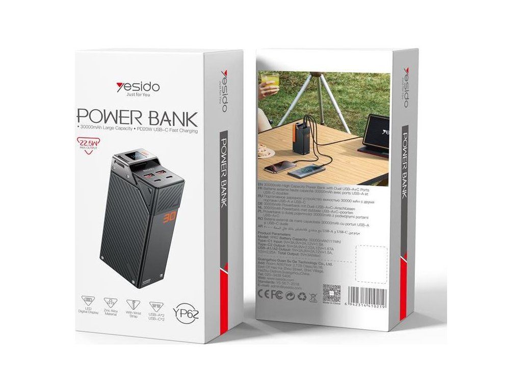 Powerbanka Yesido YP62 s obrovskou kapacitou 30 000 mAh a výkonem 22,5 W je ideálním společníkem pro všechny, kteří potřebují spolehlivý zdroj energie na dlouhých cestách nebo v místech bez přístupu k elektrické síti.