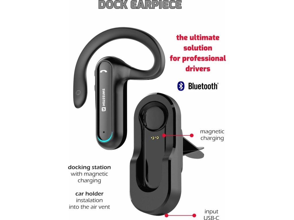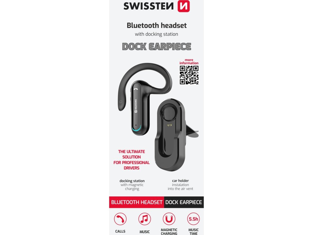 Ergonomický bluetooth headset SWISSTEN EARPIECE s dlouhou výdrží s dobíjecím držákem do auta a magnetickým dobíjecím kabelem. Baleno v blistru SWISSTEN.