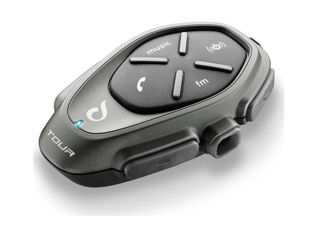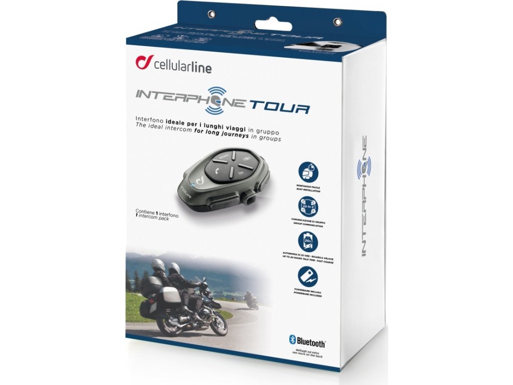 Interphone TOUR je TOP produkt z nové řady interphonů od firmy Cellularline. Špičková úroveň konstrukce a nový, elegantní tvar tvoří černé, titanové tělo jednotky Interphone. Interphone TOUR dokáže spojit až 4 motorkáře a má maximální dosah 1,5km. Je kompatibilní se všemi smartphony s technologií Bluetooth, umožní vám hovory se spolucestujícími, poslech hudby nebo příjímání instrukcí z GPS navigace. Interphone TOUR je kompatibilní se všemi helmami a instalace na helmu je velmi rychlá snadná. Je absolutně voděodolný, jeho baterie má rekordní výdrž až 20 hodin a velmi rychle se nabíjí díky technologii FAST CHARGE. Interphone TOUR spojuje pokročilou technologii, úžasný design a uživatelsky přívětivé ovládání, je ideální na dlouhé cesty.