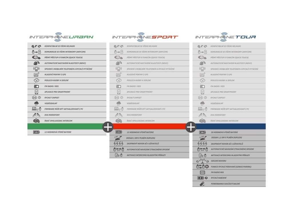 - kompatibilita: všechny běžné přilby na trhu/ všechny smartphony s Bluetooth technologií/ GPS navigace s Bluetooth® technologie a HF profilem/ intercomy jiných značek/ všemi staršími modely Interphone