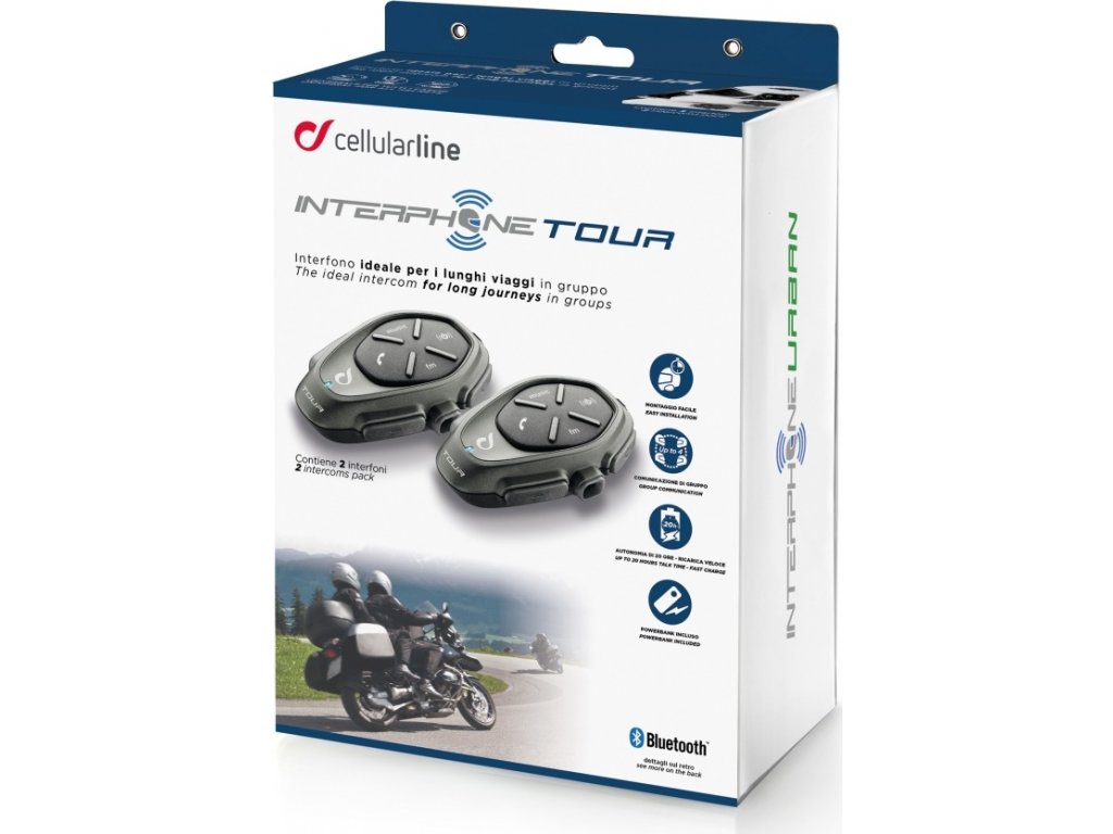 Interphone TOUR je TOP produkt z nové řady interphonů od firmy Cellularline. Špičková úroveň konstrukce a nový, elegantní tvar tvoří černé, titanové tělo jednotky Interphone. Interphone TOUR dokáže spojit až 4 motorkáře a má maximální dosah 1,5km. Je kompatibilní se všemi smartphony s technologií Bluetooth, umožní vám hovory se spolucestujícími, poslech hudby nebo příjímání instrukcí z GPS navigace. Interphone TOUR je kompatibilní se všemi helmami a instalace na helmu je velmi rychlá snadná. Je absolutně voděodolný, jeho baterie má rekordní výdrž až 20 hodin a velmi rychle se nabíjí díky technologii FAST CHARGE. Interphone TOUR spojuje pokročilou technologii, úžasný design a uživatelsky přívětivé ovládání, je ideální na dlouhé cesty.
