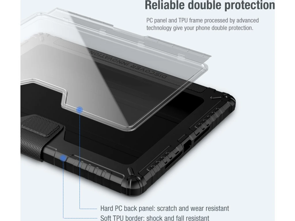 Nillkin Bumper Pro ochranné pouzdro s praktickým flipem, který slouží zároveň jako stojánek je vyrobeno z vybraného materiálu TPU a PC. Čočka fotoaparátu je chráněna posuvným krytem Zajišťuje dokonalou ochranu a funkčnost. Zesílené rohy perfektně ochrání hrany tabletu. Flip krytu je z PU kůže. Unikátní skládací kryt zobrazuje iPad ve všech zvolených úhlech pro psaní, čtení a prohlížení webu. Složení krytu je velmi jednoduché. Vestavěná sestava magnetů podporuje funkce iPad pro automatické probuzení / spánek. V pouzdře najdete prostor pro vaši Apple tužku. Vlastnosti - transparentní PC zadní strana - TPU rámeček - posuvný kryt zadního fotoaparátu - přední strana z umělé kůže - ochranný kryt - přesné výřezy na fotoaparát, konektory, reproduktory - kompletní ochrana - kvalitní provedení