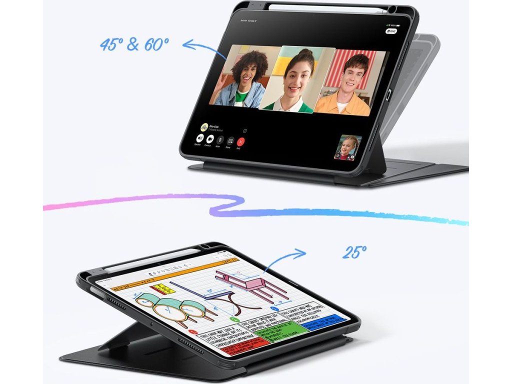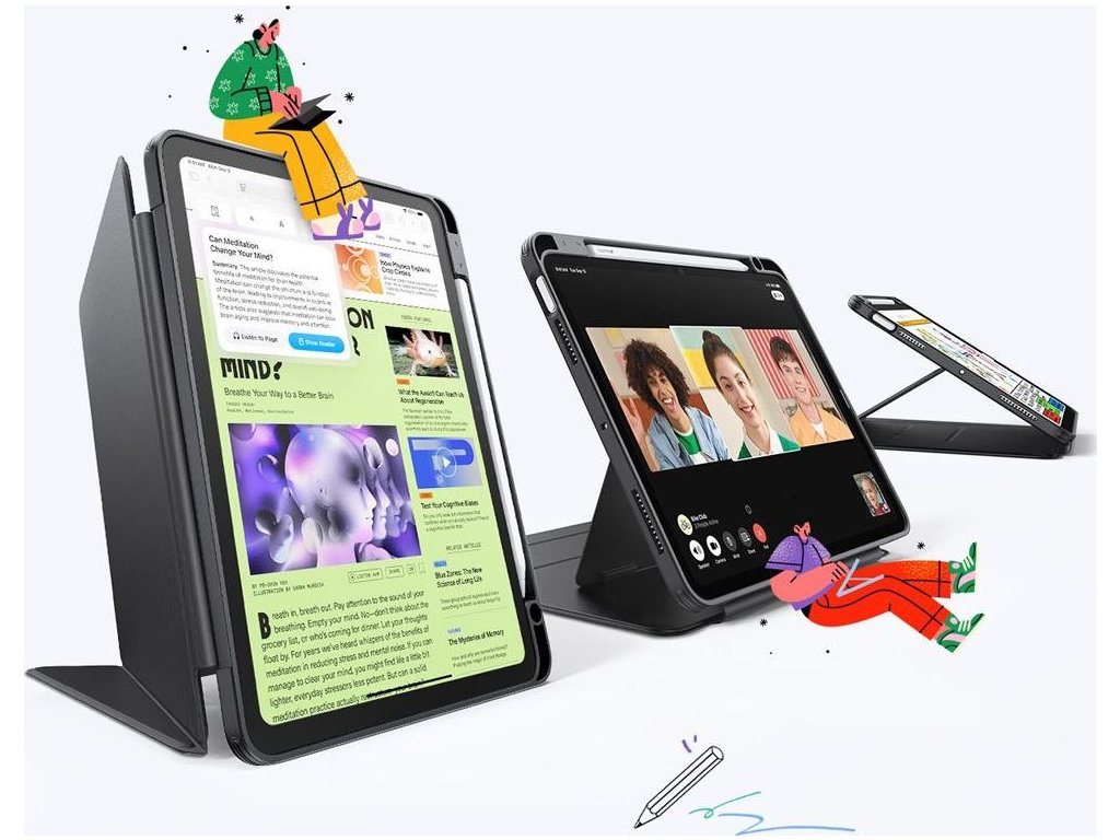 Jednou z největších výhod pouzdra ESR Flip Case je jeho univerzálnost – pouzdro lze snadno přeměnit na stojánek s nastavitelným úhlem sklonu, ideální pro psaní, sledování filmů, videokonference nebo kreslení. Vestavěný držák Apple Pencil vám umožní nejen jeho uložení, ale také podporuje magnetické nabíjení, takže váš stylus je vždy připraven k akci.