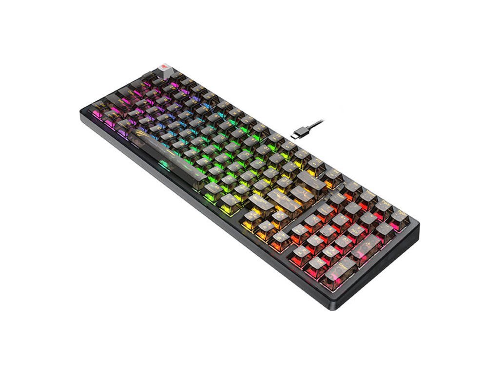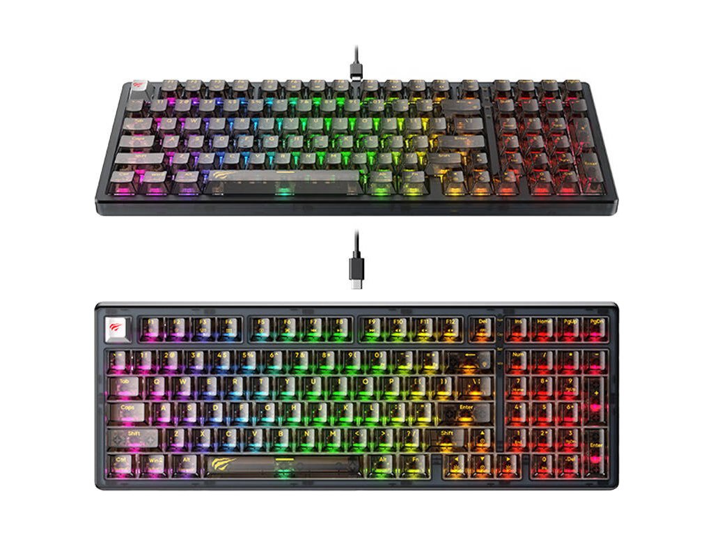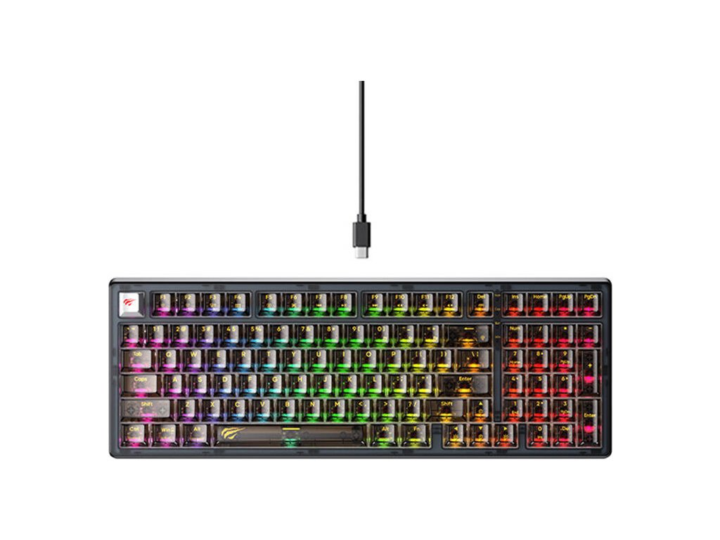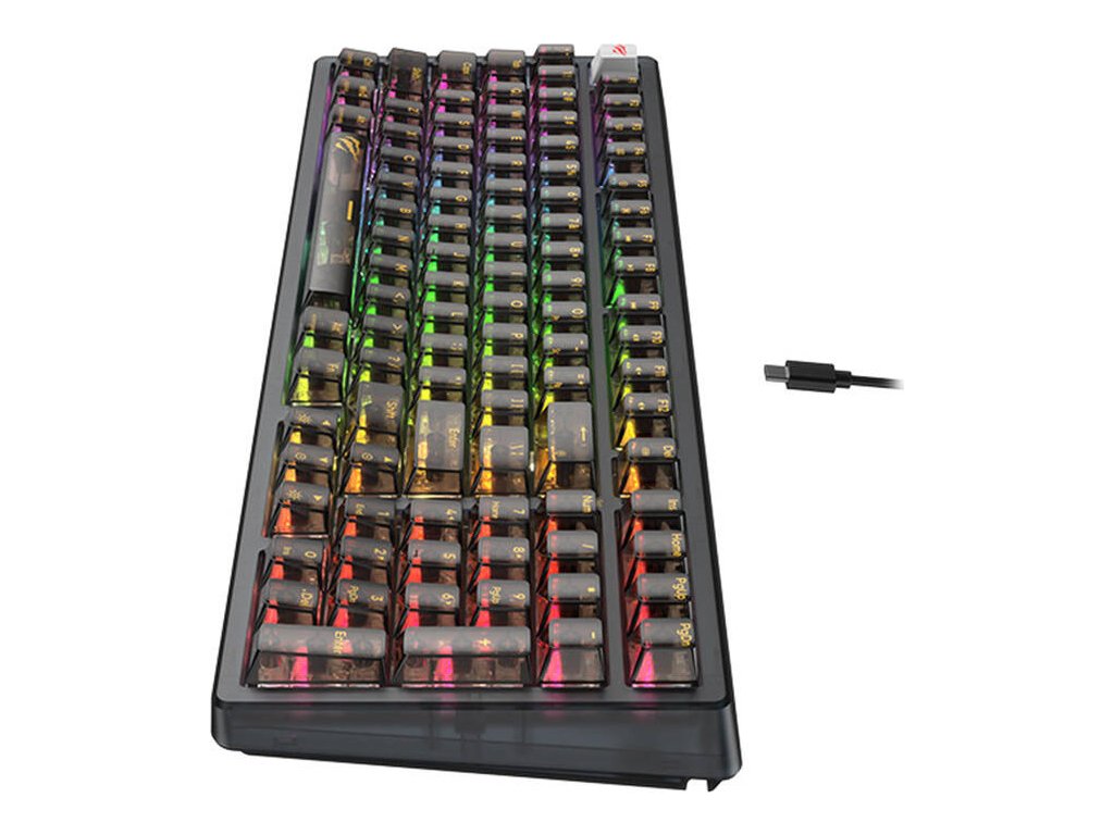 Klávesnice Havit KB875L vyniká nejen svým působivým výkonem, ale také estetickým designem. Jeho průhledné pouzdro a klávesy vyrobené z dotykového PC materiálu mu dodávají moderní a stylový vzhled, který jistě upoutá pozornost mnoha hráčů. Jeho kompaktní design nezabere mnoho místa na vašem stole a RGB podsvícení zvýší vaši úroveň ponoření během hraní.