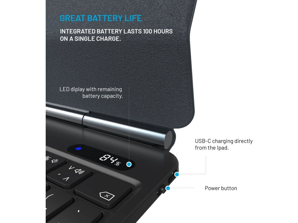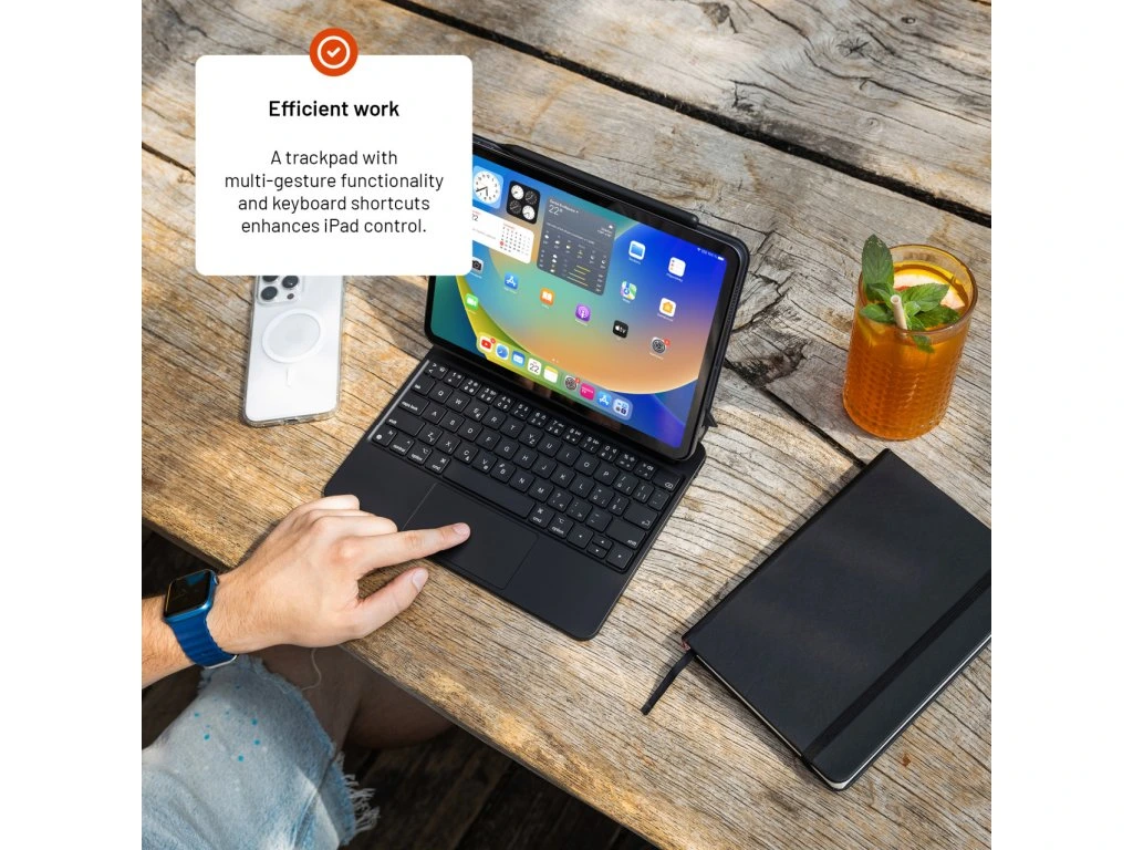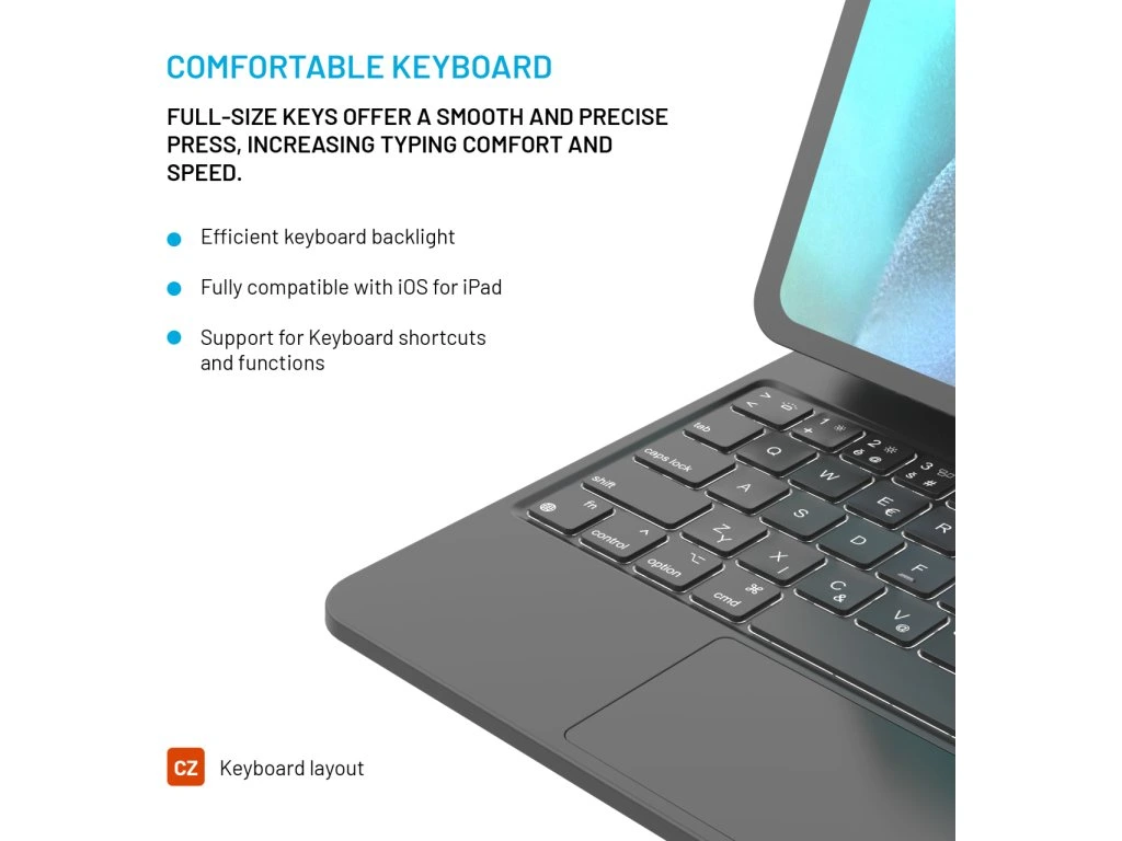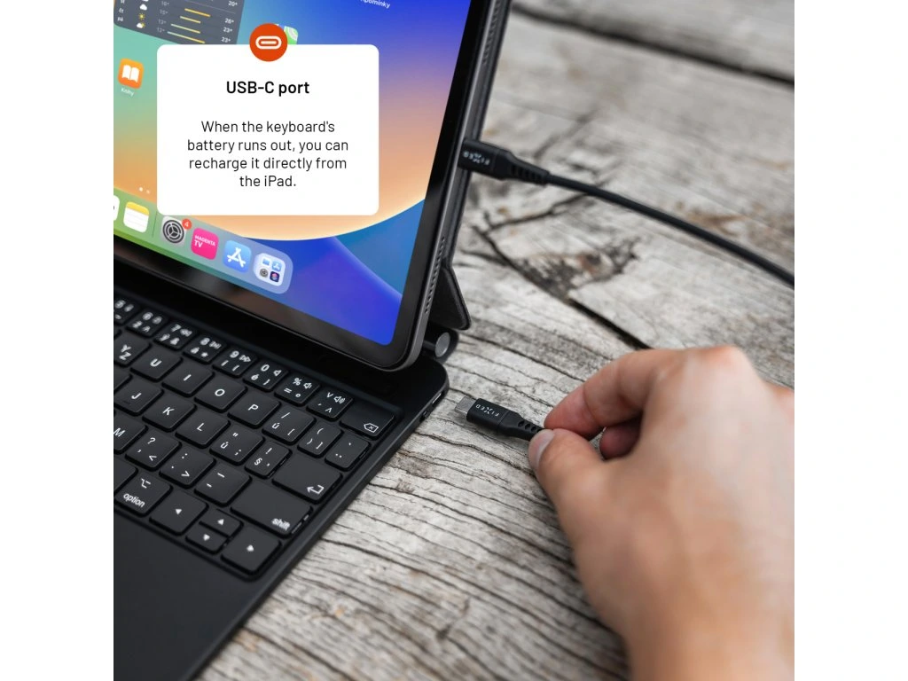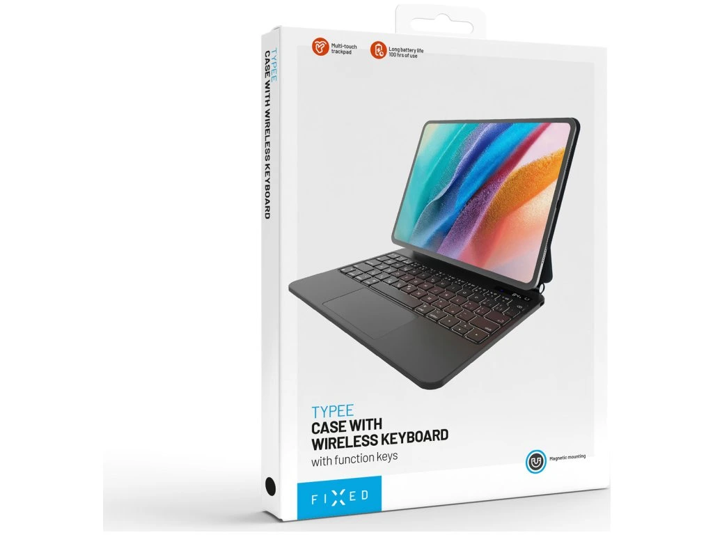 Pouzdro FIXED Typee spojuje bezdrátovou klávesnici a bezchybný trackpad spolu s ochranou tabletu iPad. Klávesnice je vybavena pětibodovým multidotykovým trackpadem a funkčními klávesami, které podporují specifická gesta a klávesové zkratky pro iPadOS, aby byl uživatelský zážitek podobný práci na MacBooku. Tablet lze snadno přichytit pomocí magnetů na vnitřní stranu pouzdra, což vloženému zařízení zajišťuje ochranu ze všech stran. Propojení s klávesnicí prostřednictvím Bluetooth zajišťuje pohodlné používání. Pouzdro je vyrobeno z kvalitních a lehkých materiálů, které dodávají zařízení stylový vzhled, ale také poskytují spolehlivou ochranu před poškrábáním, nárazy a jiným poškozením. Klávesnice disponuje vysokou výdrží baterie až 100 hodin a lze ji snadno dobíjet pomocí USB-C kabelu přímo z tabletu. Nastavitelný úhel naklonění od 65° do 125° umožňuje najít ideální polohu pro práci nebo sledování filmů. Dalšími praktickými funkcemi jsou režim automatického uspání a probuzení (sleep and wake) a informační LCD displej. Klávesnice s českým rozložením kláves je kompatibilní s Apple iPad 10.9"" (10. generace). Pouzdro s klávesnicí promění váš iPad v ještě výkonnější a univerzálnější nástroj, který vás bude provázet na každém kroku.
