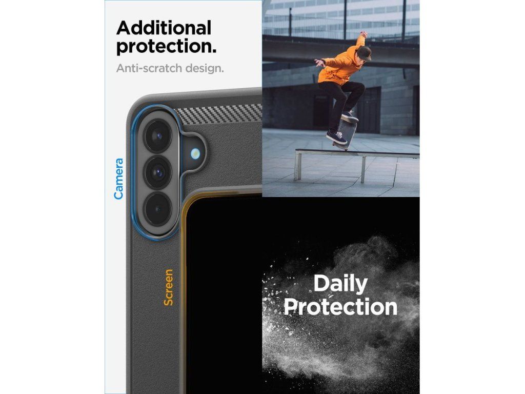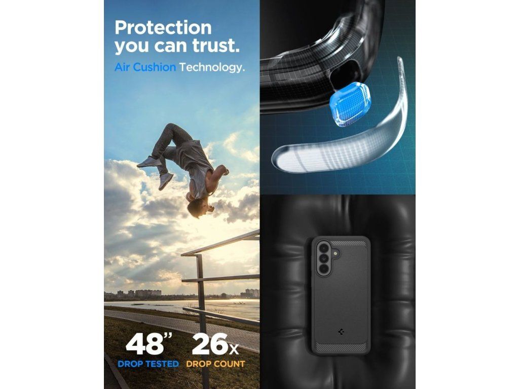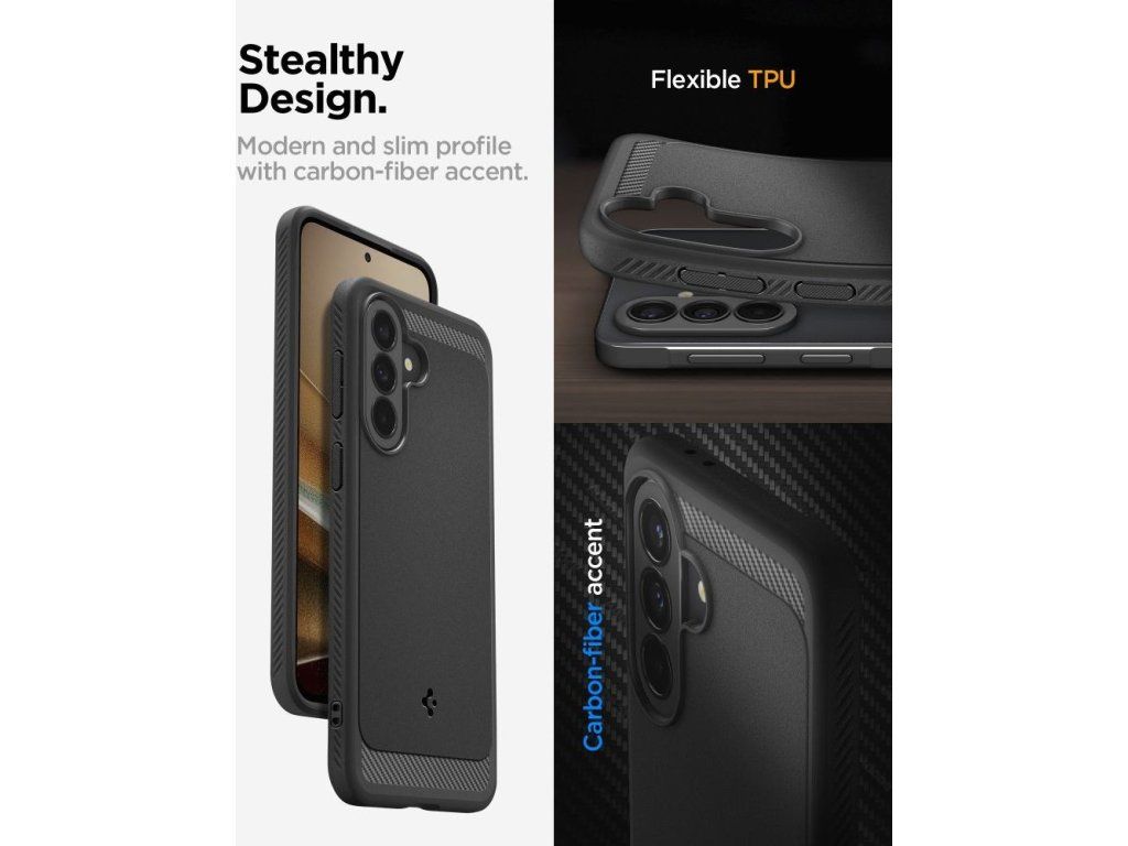 Ochranný kryt Spigen Rugged Armor pro Samsung Galaxy A37 5G nabízí elegantní design s texturou uhlíkových vláken a špičkovou odolnost proti nárazům díky technologii Spider Web.