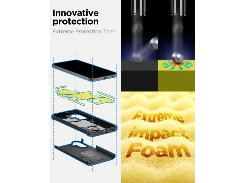 Kryt využívá technologii Extreme Protection Tech, která zahrnuje vnitřní vrstvu speciální nárazové pěny. Zvýšené hrany kolem displeje a fotoaparátu zajišťují, že se citlivé části telefonu nedotýkají povrchu při položení, čímž eliminují riziko poškrábání.
