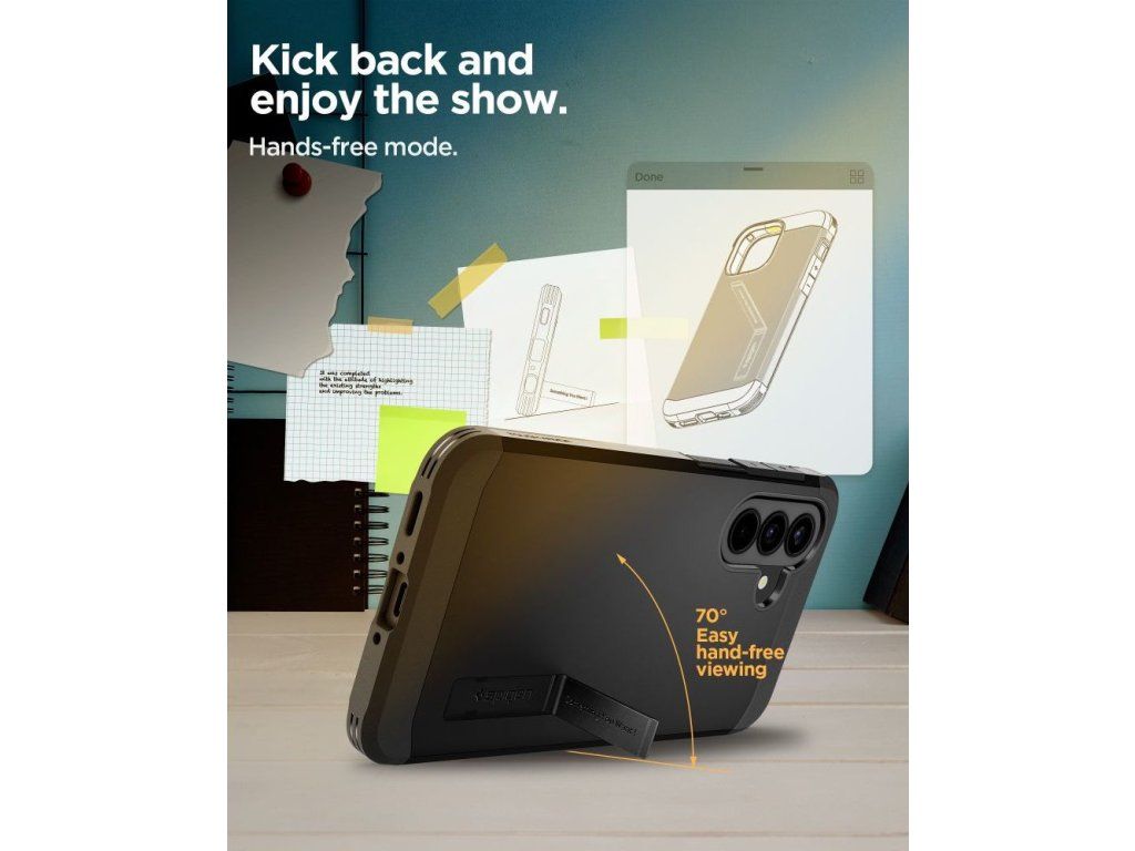 Součástí zadní strany je praktický výklopný stojánek, který umožňuje sledování videí nebo handsfree hovory v pohodlné horizontální poloze. Kryt je i přes svou robustnost navržen tak, aby zachoval snadný přístup ke všem portům a tlačítkům.