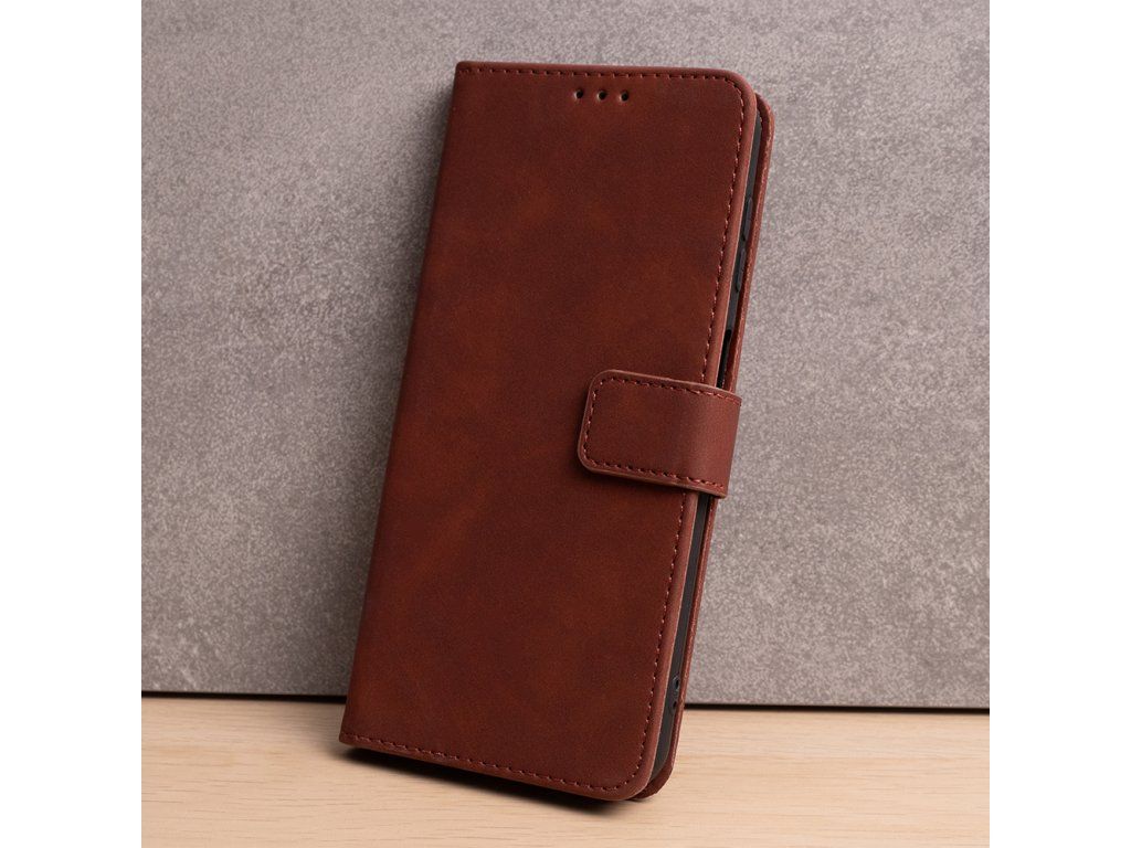 Elegantní hnědý kryt typu kniha pro Samsung Galaxy A57 5G s funkcí peněženky a stojánku. Vyroben z matné ekokůže, nabízí 3 kapsy na karty a spolehlivé magnetické zavírání.