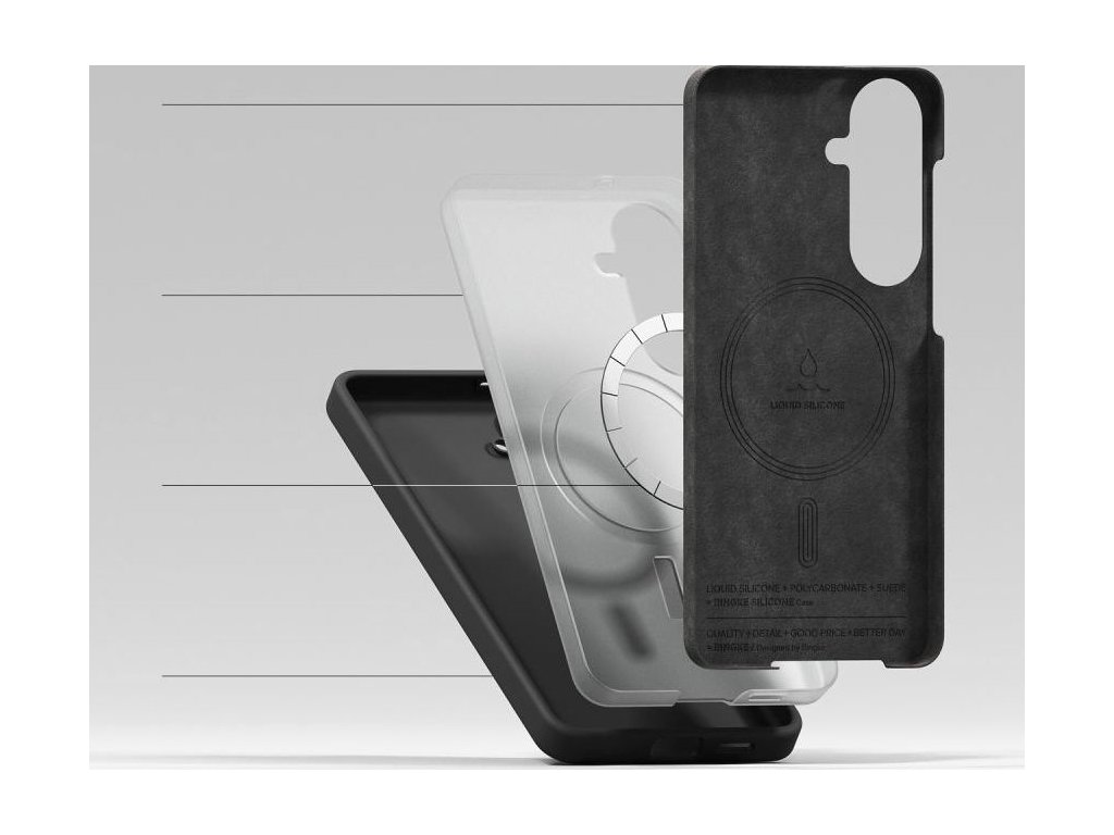 Ringke Silicone MagSafe je tenký a odolný kryt s hybridním designem. Jeho třívrstvá struktura kombinuje měkký silikonový vnější plášť s výztužným PC rámem na vnitřní straně, který je potažen měkkým mikrovláknem pro ochranu zadní strany telefonu před poškrábáním. Materiál dokonale kopíruje tvar zařízení a poskytuje plný přístup ke všem portům a tlačítkům. Silikonový povrch je příjemný na dotek a zaručuje bezpečný úchop, čímž minimalizuje riziko vyklouznutí telefonu z ruky při každodenním používání.