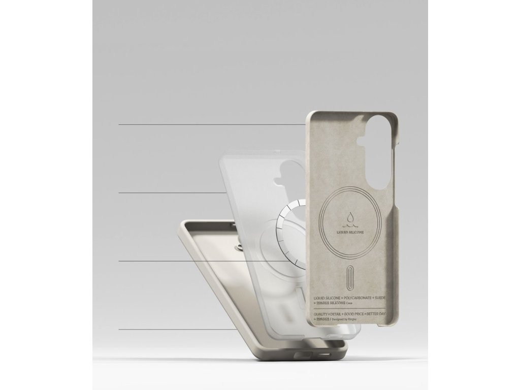 Ringke Silicone MagSafe je tenký a odolný kryt s hybridním designem. Jeho třívrstvá struktura kombinuje měkký silikonový vnější plášť s výztužným PC rámem na vnitřní straně, který je potažen měkkým mikrovláknem pro ochranu zadní strany telefonu před poškrábáním. Materiál dokonale kopíruje tvar zařízení a poskytuje plný přístup ke všem portům a tlačítkům. Silikonový povrch je příjemný na dotek a zaručuje bezpečný úchop, čímž minimalizuje riziko vyklouznutí telefonu z ruky při každodenním používání.