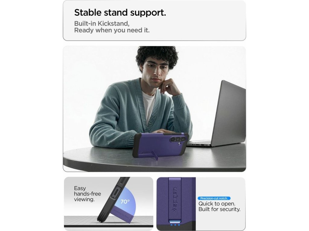 Vestavěný stojánek umožňuje pohodlné sledování filmů, videohovory nebo prohlížení obsahu bez použití rukou. Telefon můžete umístit v orientaci na šířku na stůl, stůl nebo na cesty, aniž byste ho museli držet v rukou. Zvýšené okraje kolem obrazovky a fotoaparátu chrání tyto citlivé prvky před přímým kontaktem s povrchy, čímž eliminují riziko poškrábání při každodenním používání.
