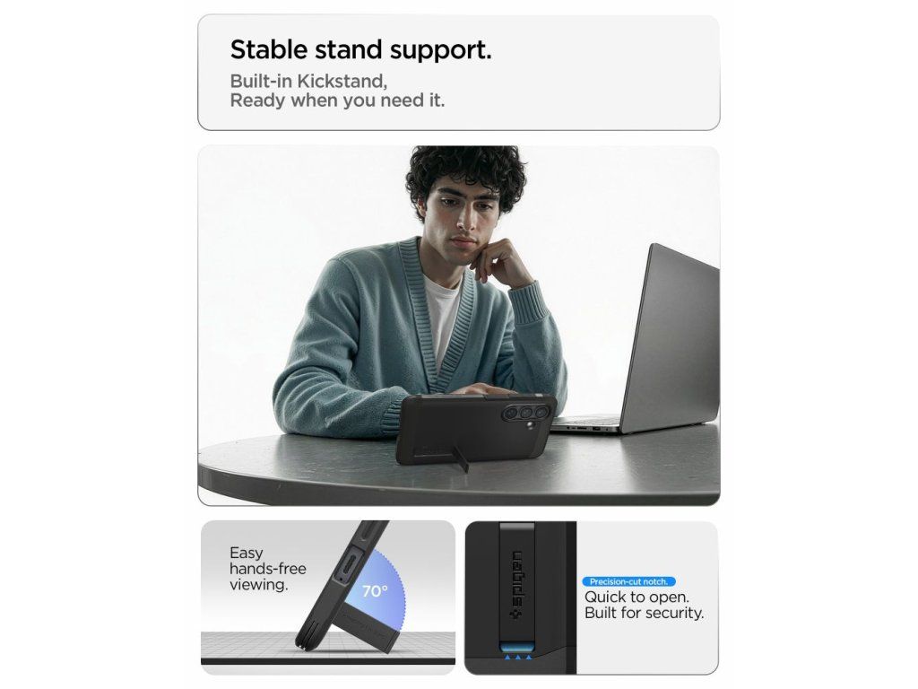 Vestavěný stojánek umožňuje pohodlné sledování filmů, videohovory nebo prohlížení obsahu bez použití rukou. Telefon můžete umístit v orientaci na šířku na stůl, stůl nebo na cesty, aniž byste ho museli držet v rukou. Zvýšené okraje kolem obrazovky a fotoaparátu chrání tyto citlivé prvky před přímým kontaktem s povrchy, čímž eliminují riziko poškrábání při každodenním používání.