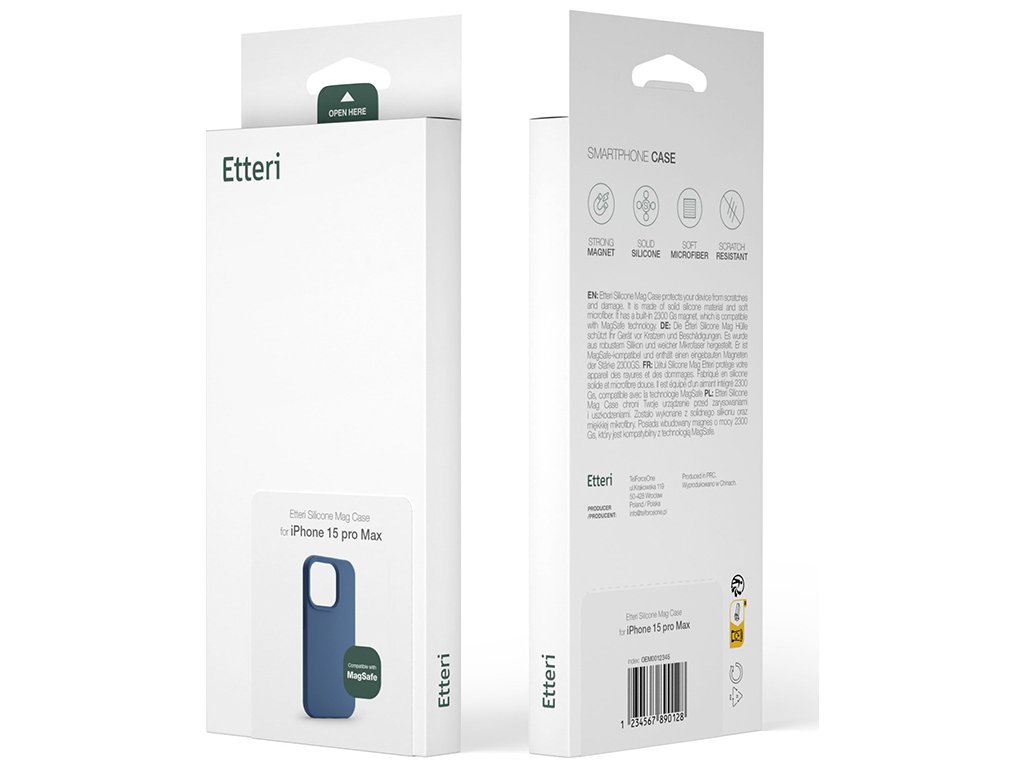 Zkrácený popis uvádí: Silikonový kryt Etteri Silicone Mag poskytuje telefonu solidní ochranu a plnou kompatibilitu s MagSafe díky vestavěným magnetům o síle 2300 Gs. Měkký, příjemný na dotek silikonový a mikrovláknový vnitřek chrání zařízení před poškrábáním, zatímco zvýšené okraje chrání fotoaparát. Kryt perfektně padne, má přesné výřezy a je kompatibilní s tvrzeným sklem. Elegantní minimalistické balení dotváří celek.