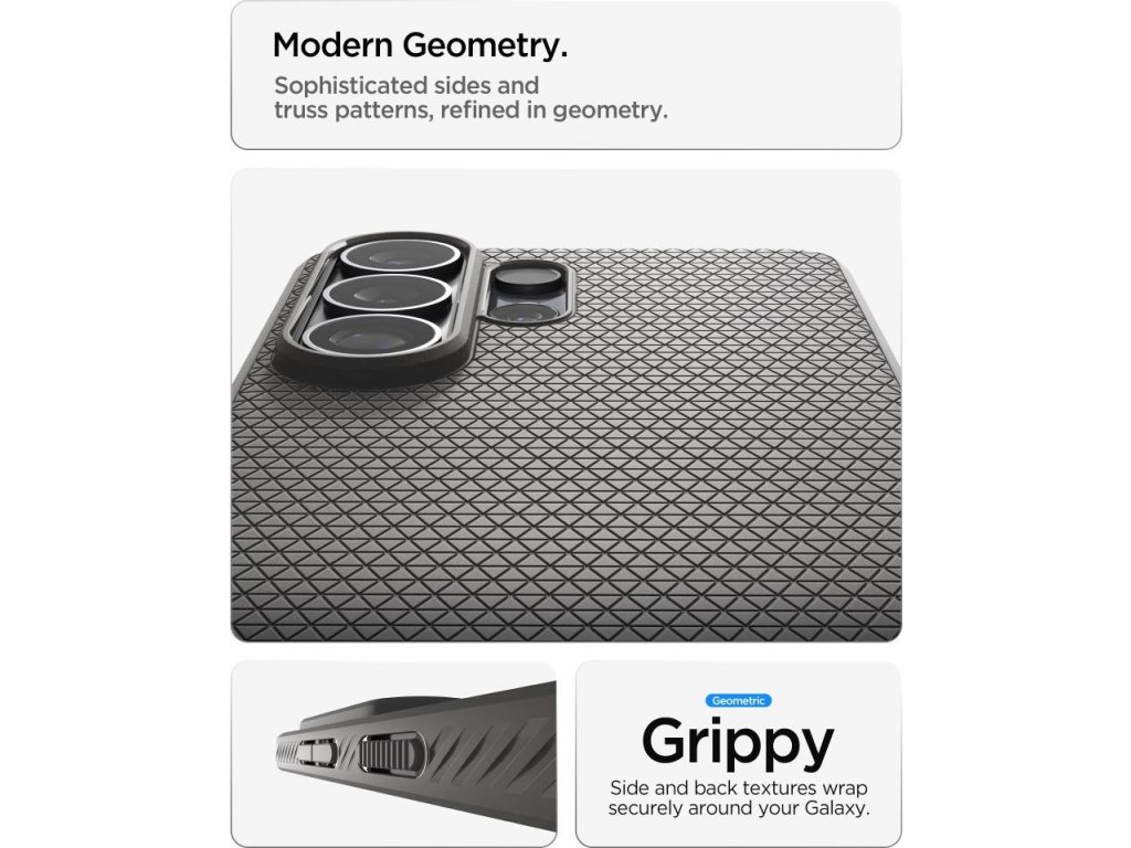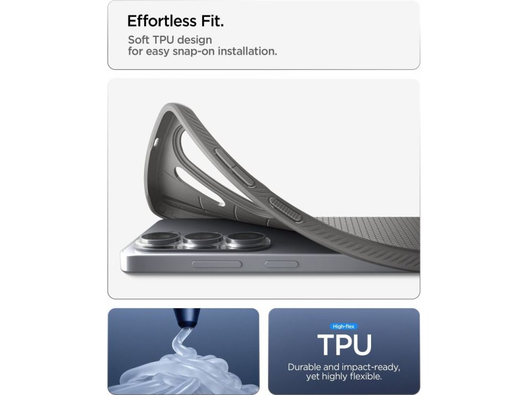 Spigen Liquid Air je tenký kryt vyrobený výhradně z odolného TPU, který kombinuje minimalistický design se spolehlivou ochranou. Matný, texturovaný povrch poskytuje bezpečný, protiskluzový úchop a příjemný dotek, čímž eliminuje riziko vyklouznutí telefonu z ruky při každodenním používání. Charakteristický geometrický vzor dodává krytu moderní vzhled, který ho odlišuje od standardních hladkých krytů.