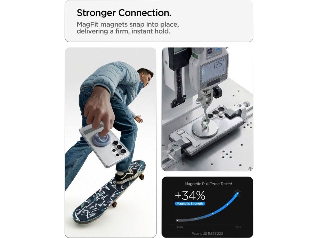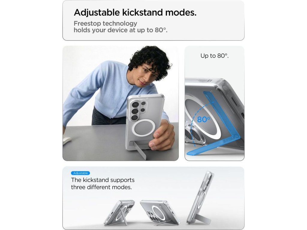 Vestavěný skládací stojan umožňuje pohodlné umístění telefonu v orientaci na šířku, což je ideální pro sledování filmů nebo televizních pořadů, videokonference nebo procházení obsahu, aniž byste museli zařízení držet v ruce. Stojan je diskrétně integrován do pouzdra a neovlivňuje štíhlý profil pouzdra, zatímco jeho pevná konstrukce poskytuje telefonu stabilní oporu.