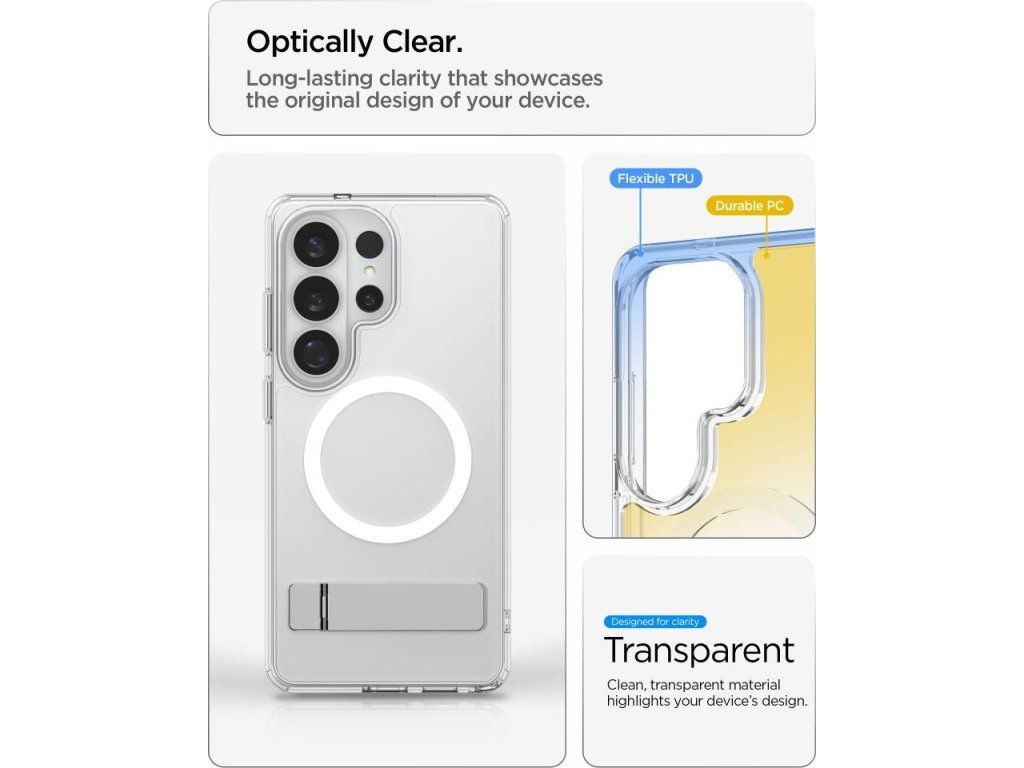 Spigen Ultra Hybrid "S" Mag MagSafe je pokročilá verze ikonického hybridního pouzdra, které kombinuje minimalistický design s vestavěným stojánkem a plnou kompatibilitou s MagSafe. Elegantní hybridní design poskytuje spolehlivou ochranu, zatímco integrovaný skládací stojánek činí toto pouzdro ideálním pro ty, kteří si cení pohodlí při sledování multimédií a videohovorech.