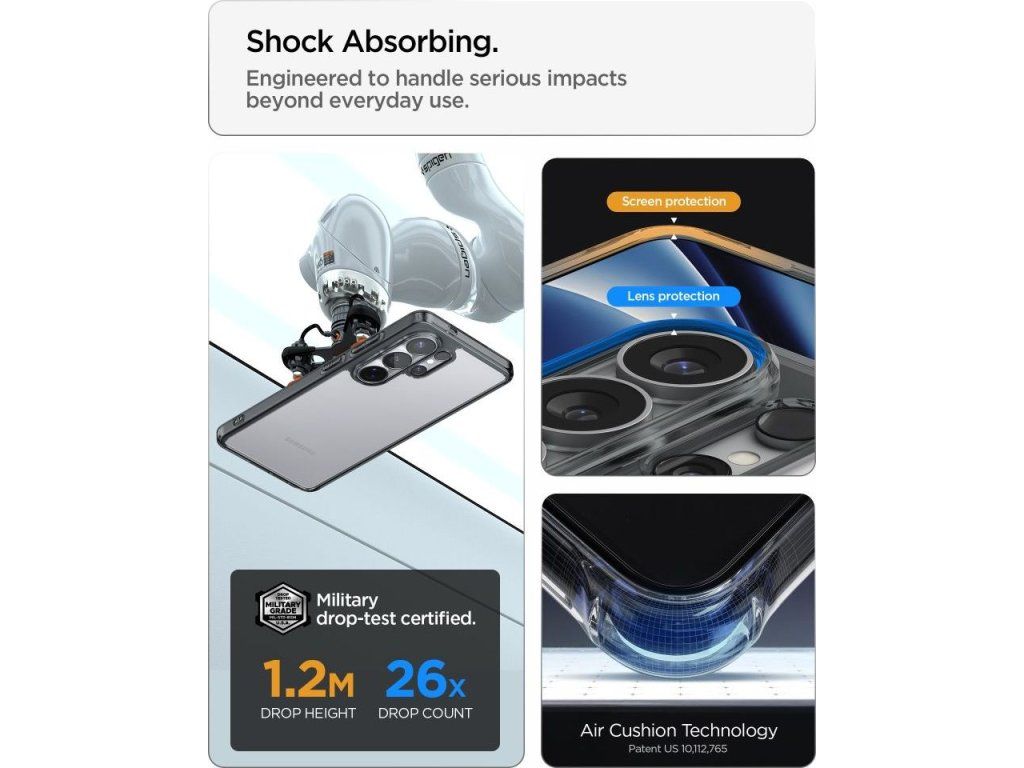 Pouzdro kombinuje flexibilní TPU rám s pevnými polykarbonátovými zády. Měkký rám absorbuje nárazy a otřesy, zatímco tvrdá záda chrání před poškrábáním. Zesílené rohy s technologií Air Cushion dále absorbují nárazy při pádu. Zvýšené okraje kolem obrazovky a fotoaparátu chrání nejcitlivější prvky před kontaktem se zemí.