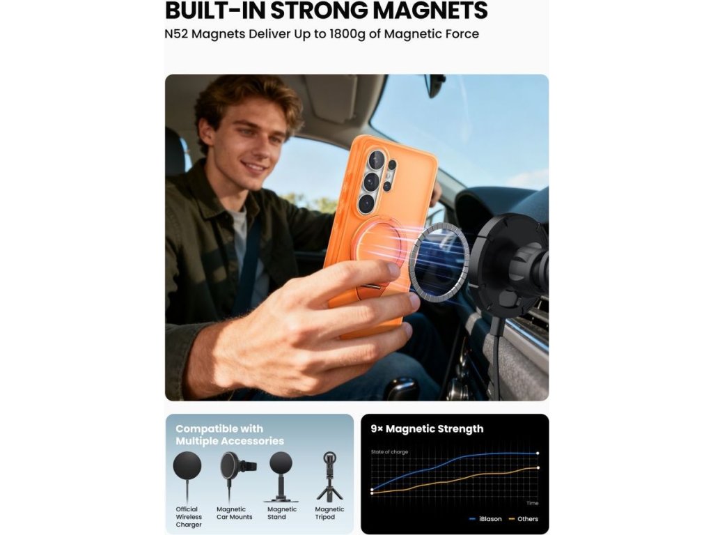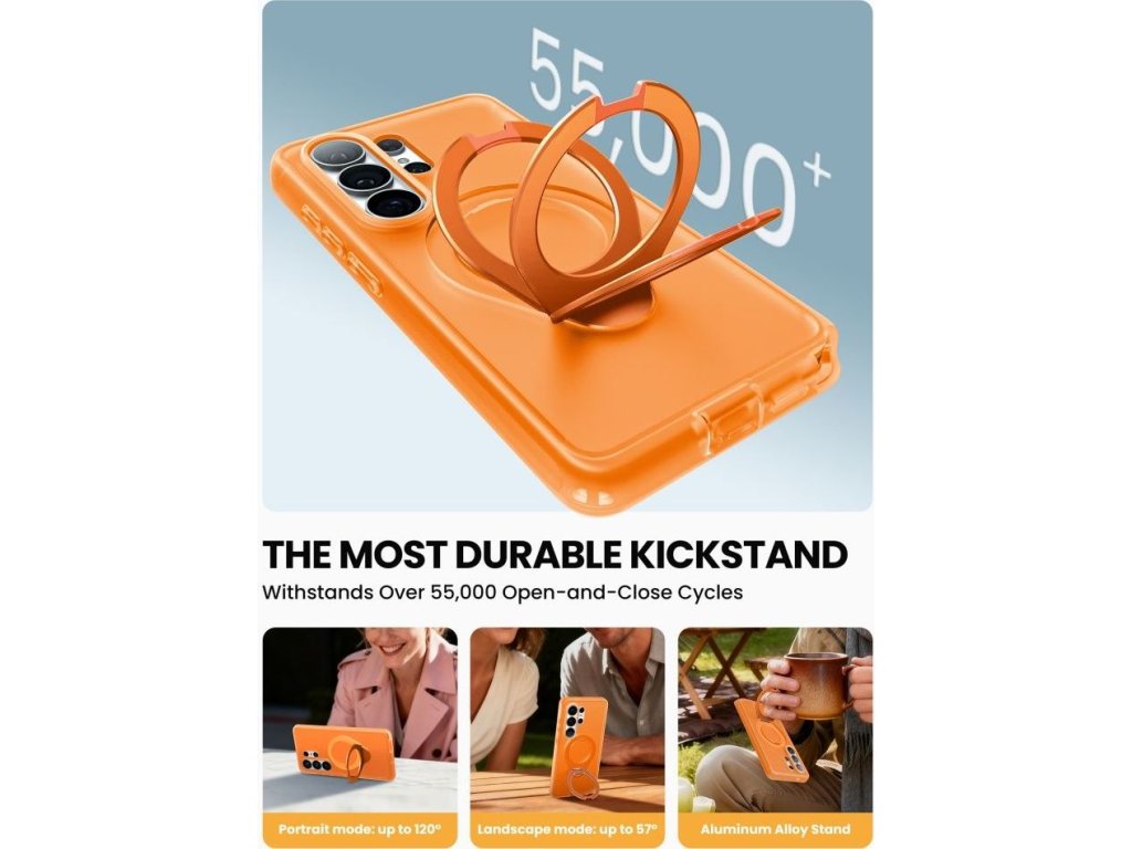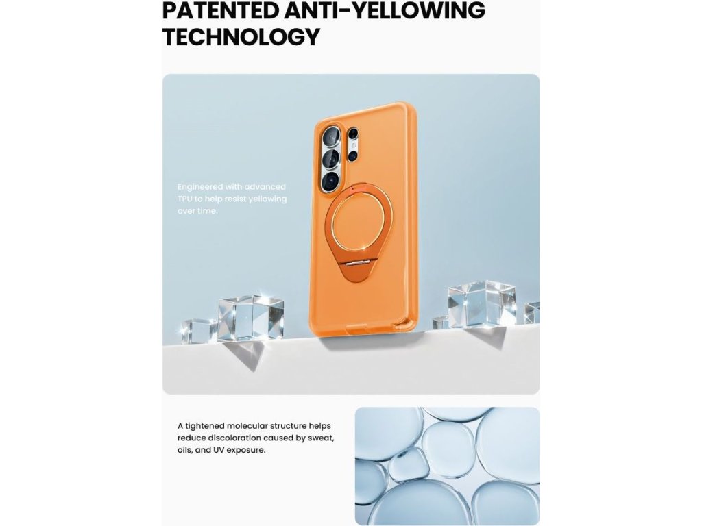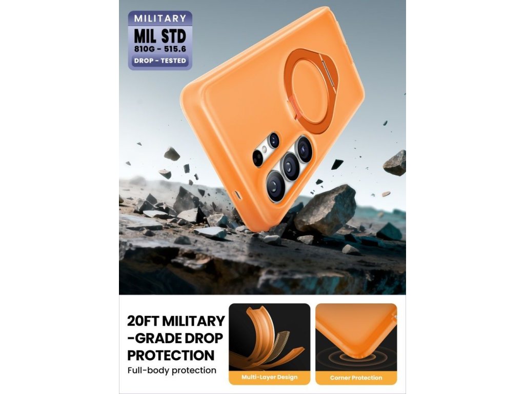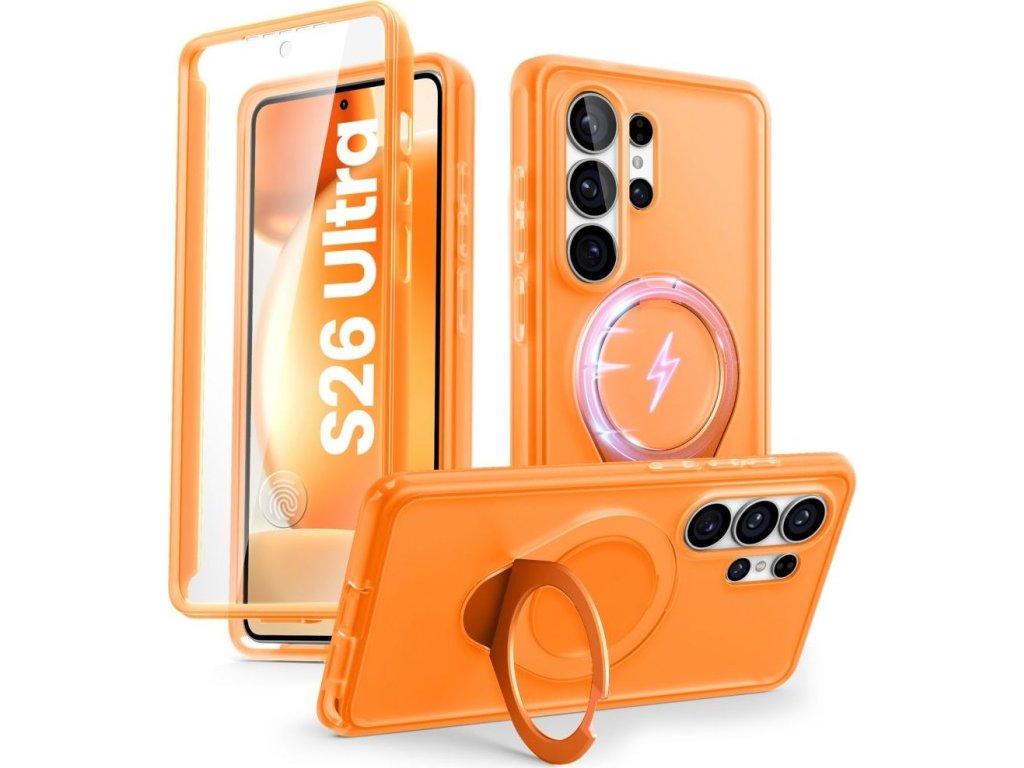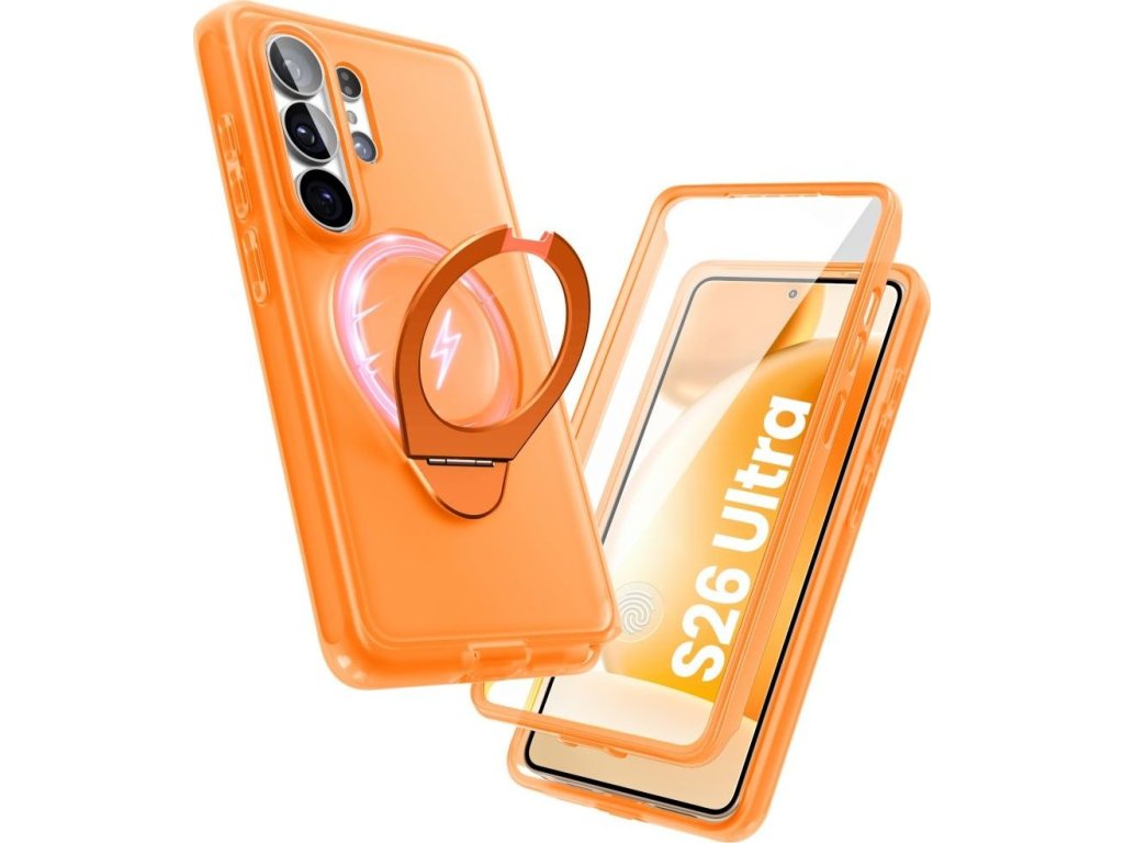 Vestavěný magnetický kroužek MagSafe zajišťuje plnou kompatibilitu s magnetickým příslušenstvím, včetně bezdrátových nabíječek, držáků do auta a powerbank. Hliníkový kroužek na prst slouží dvojímu účelu – poskytuje bezpečný úchop a slouží jako stojánek v orientaci na výšku i na šířku.
