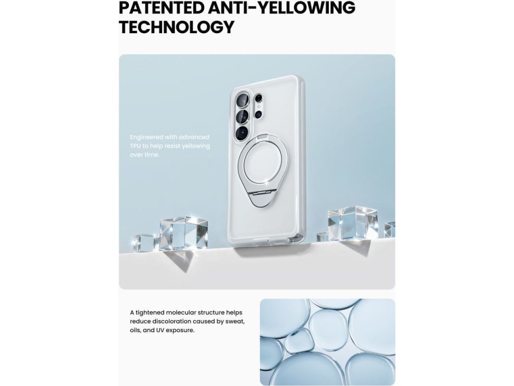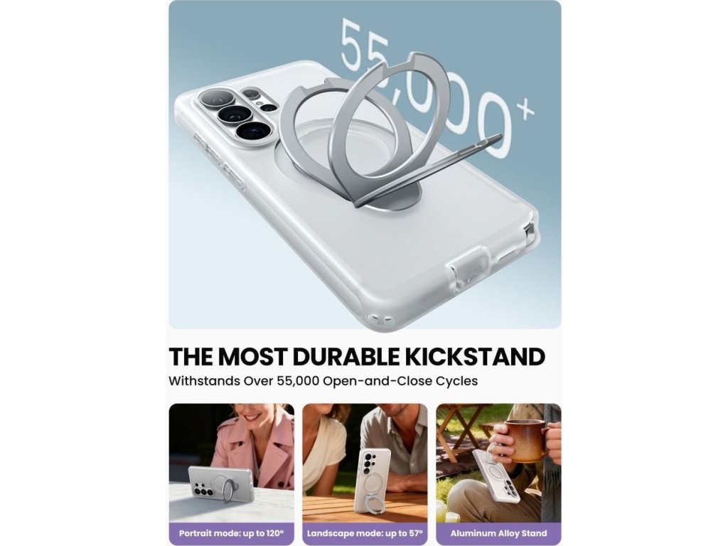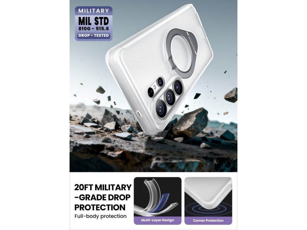 Vestavěný magnetický kroužek MagSafe zajišťuje plnou kompatibilitu s magnetickým příslušenstvím, včetně bezdrátových nabíječek, držáků do auta a powerbank. Hliníkový kroužek na prst slouží dvojímu účelu – poskytuje bezpečný úchop a slouží jako stojánek v orientaci na výšku i na šířku.