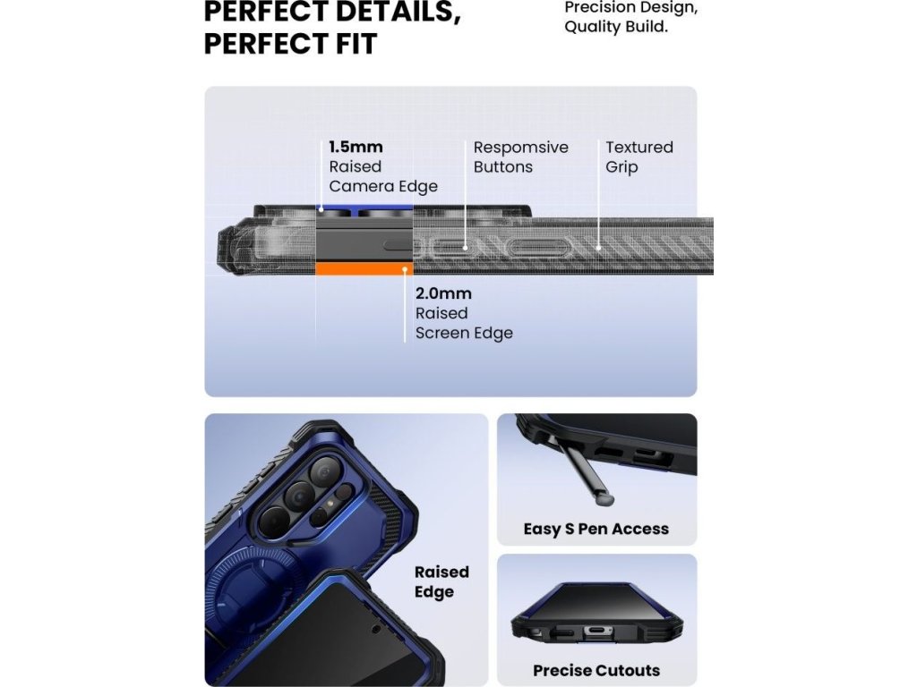 Zvýšené rámečky kolem obrazovky a modulu fotoaparátu chrání tyto citlivé prvky před přímým kontaktem s povrchy. Precizně vyrobené výřezy poskytují snadný přístup ke všem portům a funkcím telefonu. Design ve vojenském stylu s čistými liniemi dodává zařízení profesionální a odolný vzhled. Otočný klip na opasek umožňuje pohodlné nošení telefonu na opasku, takže jej nemusíte mít v kapse.