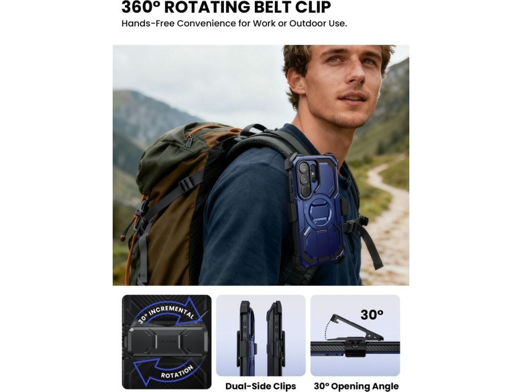 Pouzdro Supcase iBlason ArmorBox Clip Mag MagSafe je obrněné pouzdro, které kombinuje pokročilou ochranu s praktickým systémem pro nošení. Je vyrobeno z odolné kombinace flexibilního TPU a pevného PC polykarbonátu a vytváří robustní strukturu, která chrání váš telefon před pády a mechanickým poškozením. Charakteristický texturovaný povrch s geometrickým vzorem poskytuje vynikající úchop a eliminuje riziko vyklouznutí zařízení z ruky. Design splňuje standardy Mil-Grade a zaručuje spolehlivou ochranu za všech podmínek.