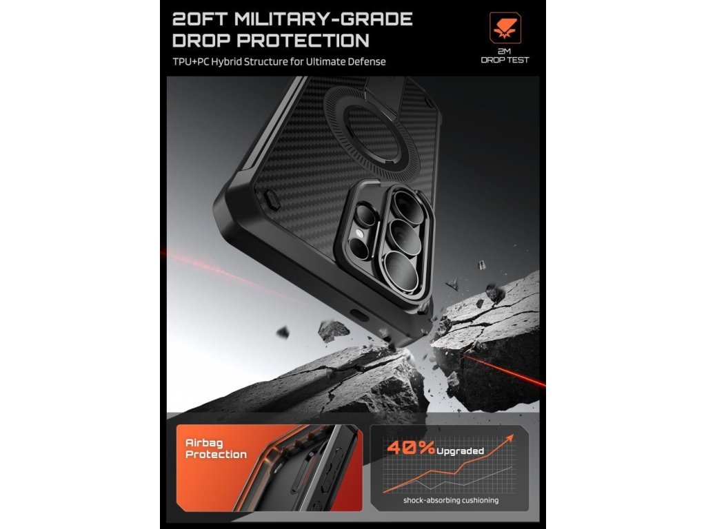 Kryt Supcase Unicorn Beetle Pro Mag MagSafe je kompletní, prémiové řešení ochrany celého těla, které kombinuje pancéřovanou ochranu s všestranností MagSafe a luxusní povrchovou úpravou. Je vyroben z kombinace aramidových vláken, termopolyuretanu (TPU) tlumícího nárazy a pevného polykarbonátu (PC) a splňuje vojenské standardy Mil-Grade pro maximální ochranu proti pádu. Součástí balení jsou dva přední kryty – s vestavěnou polykarbonátovou skořepinou nebo bez ní – což vám umožňuje přizpůsobit si pouzdro svým preferencím a potřebám.