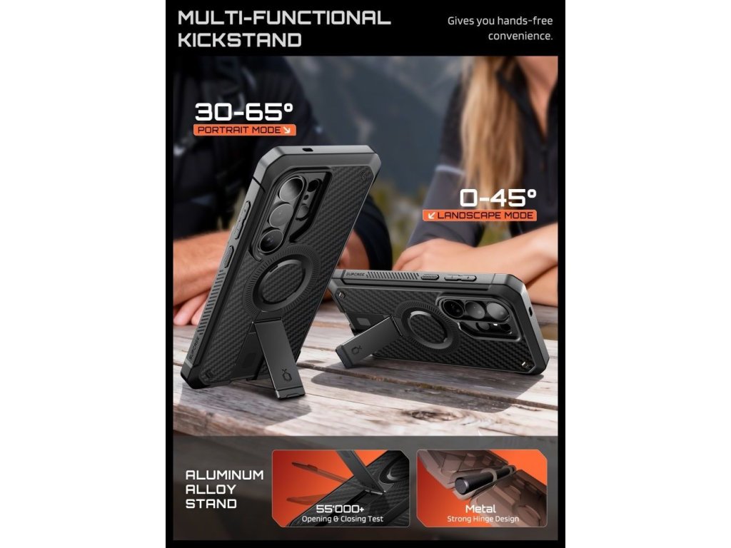 Vestavěný magnetický kroužek zajišťuje plnou kompatibilitu s MagSafe, což umožňuje bezdrátové nabíjení a bezpečné uchycení k příslušenství. Skrytý stojánek umožňuje pohodlné sledování v režimu na šířku i na výšku, zatímco otočný klip na opasek umožňuje bezpečné nošení telefonu, aniž byste ho museli mít v kapse. Nabíjecí porty jsou chráněny speciálními krytkami, které chrání před prachem a nečistotami a udržují otvory dokonale čisté.