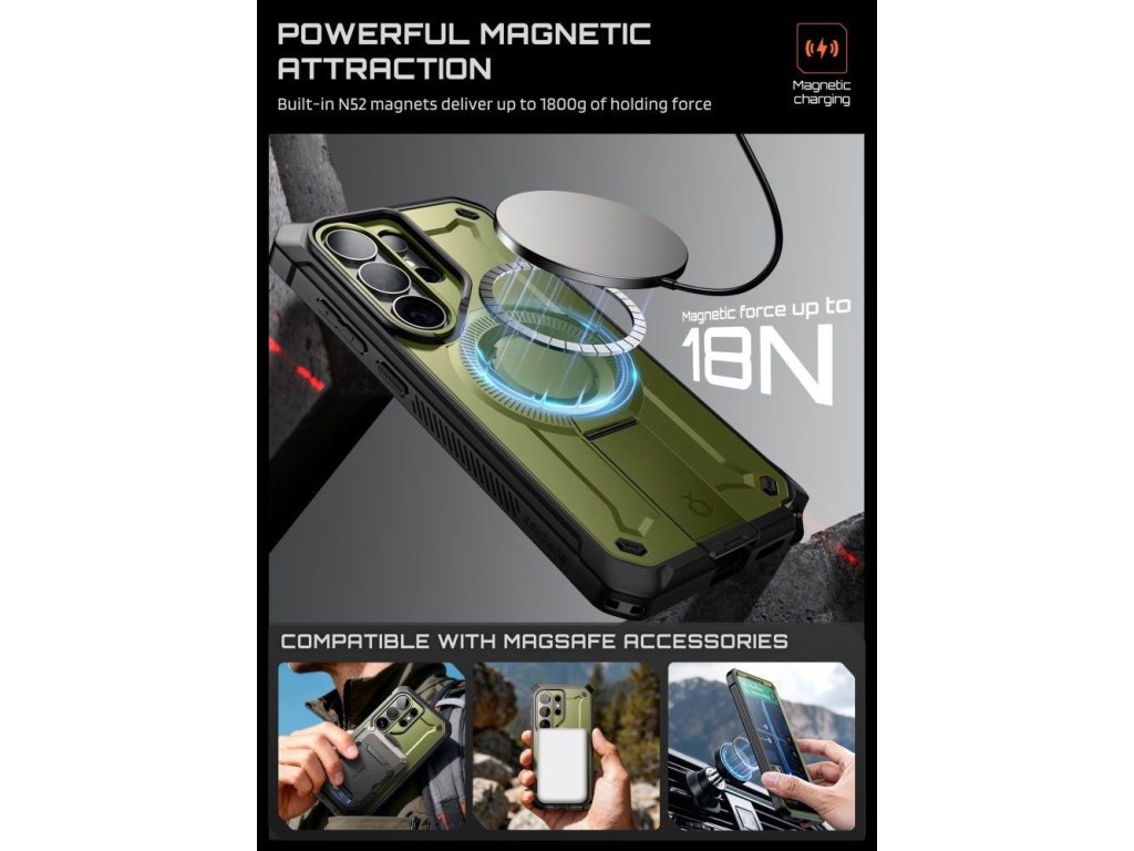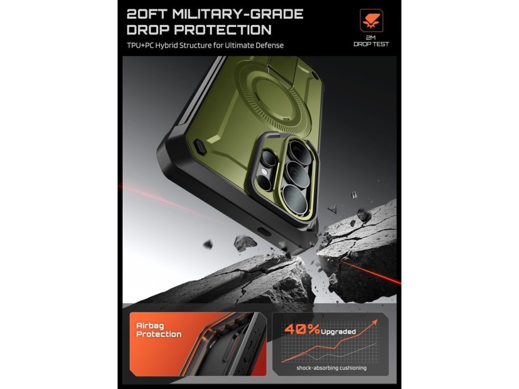 Pouzdro Supcase Unicorn Beetle Pro Mag MagSafe je kompletní ochranné řešení pro celé tělo, které kombinuje pancéřovou ochranu s všestranností MagSafe. Je vyrobeno z kombinace termopolyuretanu (TPU) absorbujícího nárazy a pevného polykarbonátu (PC) a splňuje vojenské standardy Mil-Grade pro maximální ochranu proti pádu. Součástí balení jsou dva přední kryty – s vestavěnou polykarbonátovou skořepinou nebo bez ní – což vám umožňuje přizpůsobit si pouzdro svým preferencím a potřebám.