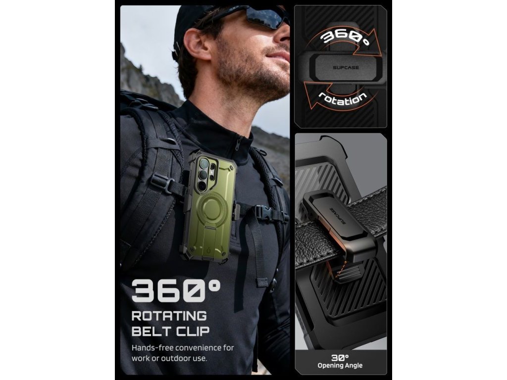 Vestavěný magnetický kroužek zajišťuje plnou kompatibilitu s MagSafe, což umožňuje bezdrátové nabíjení a bezpečné uchycení k příslušenství. Skrytý stojánek umožňuje pohodlné sledování v režimu na šířku i na výšku, zatímco otočný klip na opasek umožňuje bezpečné nošení telefonu, aniž byste ho museli mít v kapse. Nabíjecí porty jsou chráněny speciálními krytkami, které chrání před prachem a nečistotami a udržují otvory dokonale čisté.