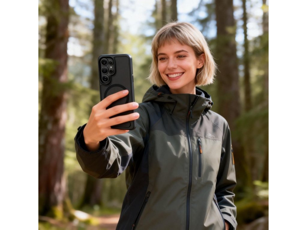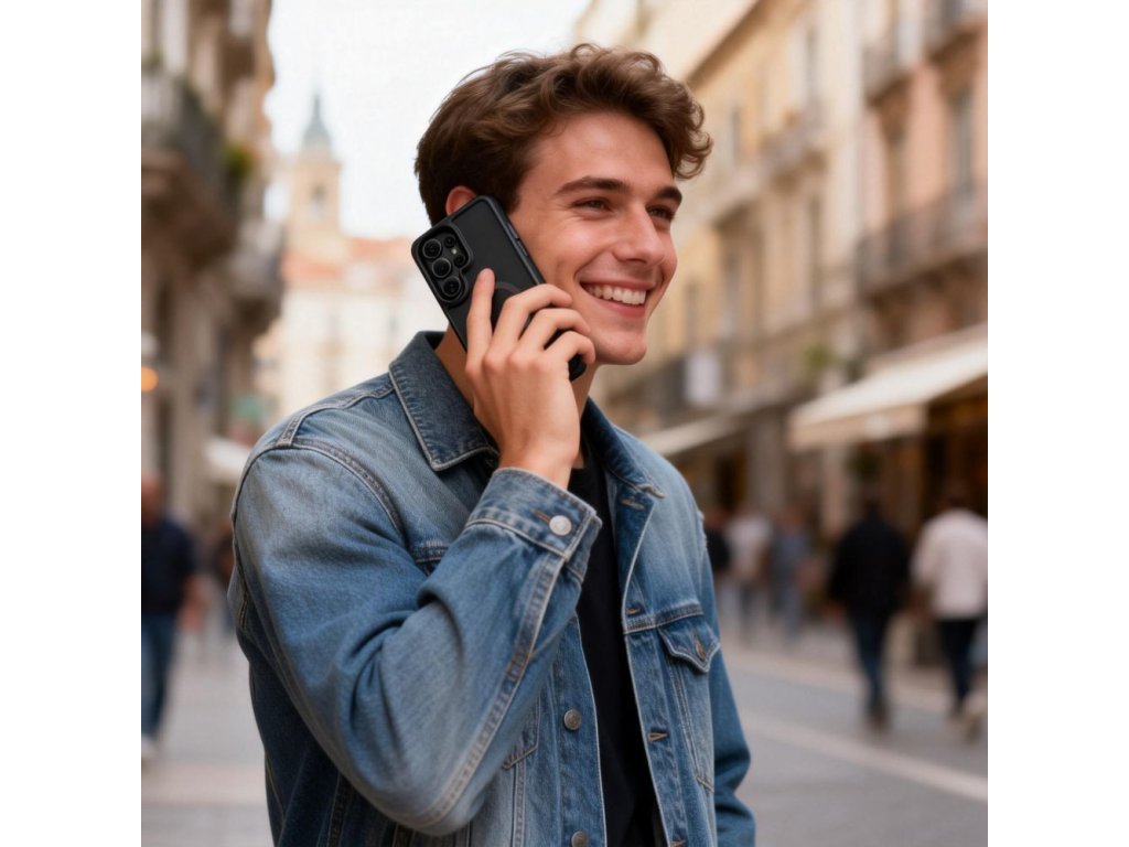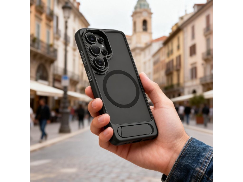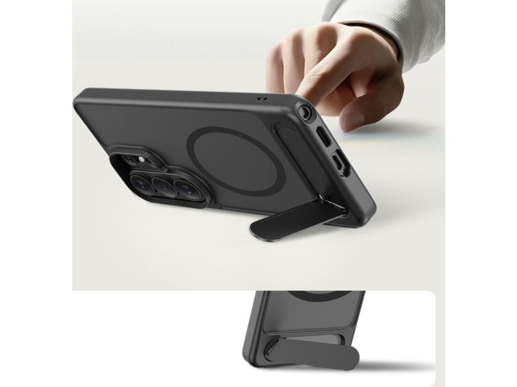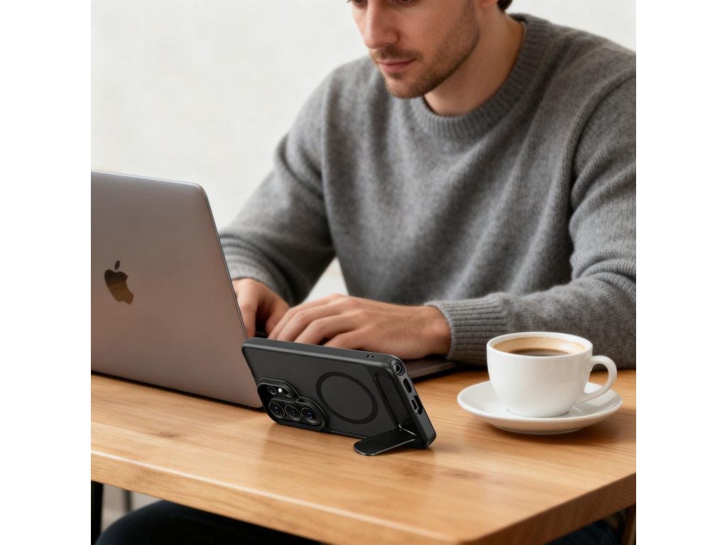 Vestavěný výsuvný stojánek umožňuje pohodlné umístění telefonu vodorovně i svisle, což je ideální pro sledování filmů, videohovory nebo prohlížení obsahu. Robustní konstrukce stojánku zajišťuje stabilitu a po použití se snadno složí do zadní části pouzdra, aniž by zvětšoval jeho objem. Vestavěný magnetický kroužek MagSafe zajišťuje plnou kompatibilitu s příslušenstvím MagSafe a umožňuje bezdrátové nabíjení bez nutnosti sundávání pouzdra.