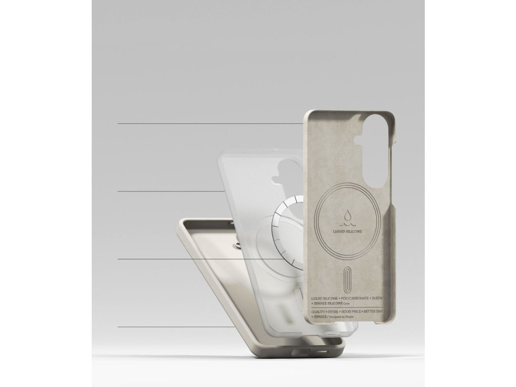 Ringke Silicone MagSafe je tenký a odolný kryt s hybridním designem. Jeho třívrstvá struktura kombinuje měkký silikonový vnější plášť s výztužným PC rámem na vnitřní straně, který je potažen měkkým mikrovláknem pro ochranu zadní strany telefonu před poškrábáním. Materiál dokonale kopíruje tvar zařízení a poskytuje plný přístup ke všem portům a tlačítkům. Silikonový povrch je příjemný na dotek a zaručuje bezpečný úchop, čímž minimalizuje riziko vyklouznutí telefonu z ruky při každodenním používání.