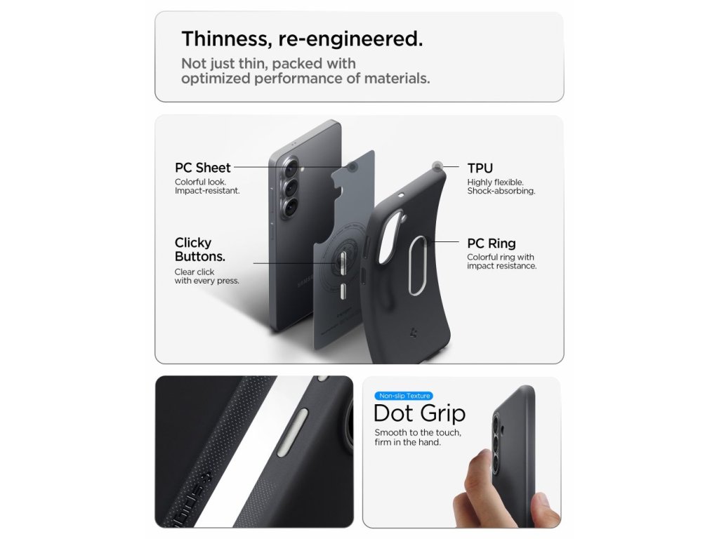 Výrobce do rohů zakomponoval technologii Air Cushion, která vytváří vzduchové mezery, jež dále tlumí nárazy a chrání zařízení v případě pádu. Barevný rámeček kolem fotoaparátu zvedá objektiv nad povrch, čímž poskytuje ochranu před poškrábáním a kontaktem s různými povrchy a zároveň dodává pouzdru osobitý a stylový vzhled. Matný povrch zajišťuje bezpečný a protiskluzový úchop a lehký a štíhlý design zajišťuje snadné používání pouzdra po celý den.