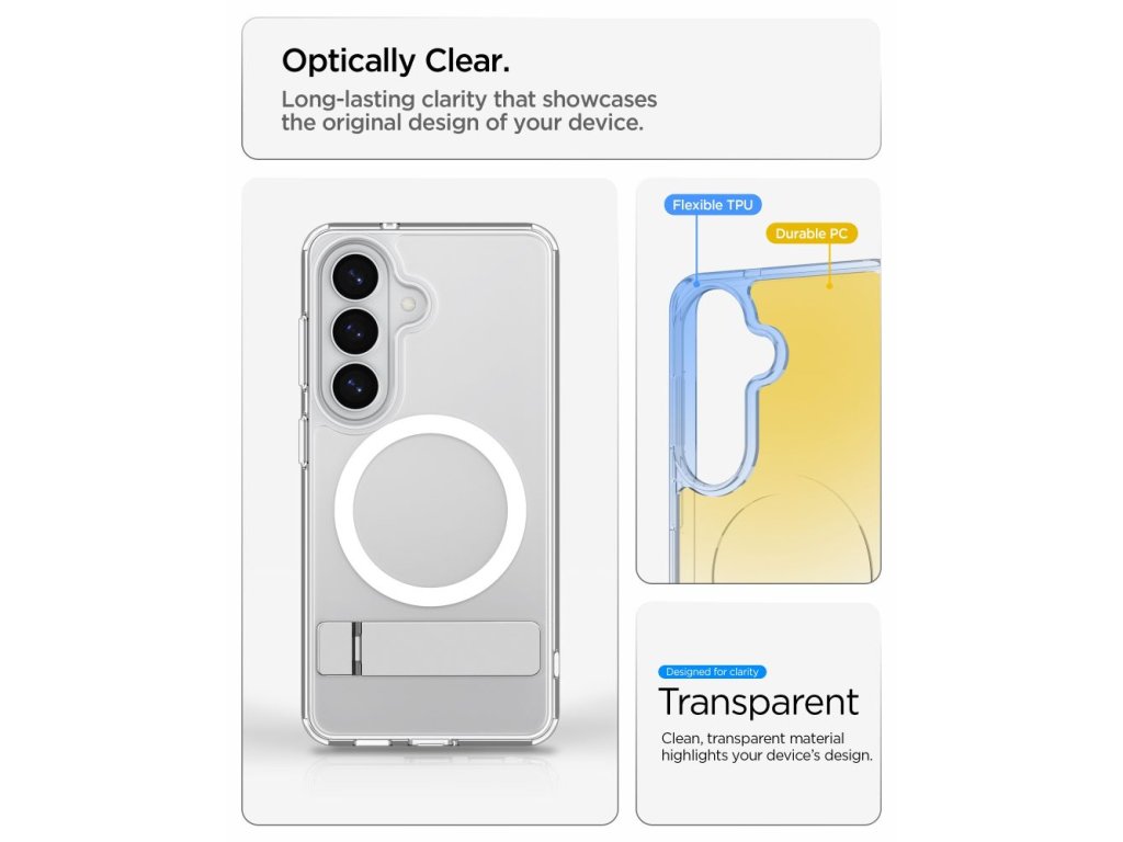 Spigen Ultra Hybrid "S" Mag MagSafe je pokročilá verze ikonického hybridního pouzdra, které kombinuje minimalistický design s vestavěným stojánkem a plnou kompatibilitou s MagSafe. Elegantní hybridní design poskytuje spolehlivou ochranu, zatímco integrovaný skládací stojánek činí toto pouzdro ideálním pro ty, kteří si cení pohodlí při sledování multimédií a videohovorech.