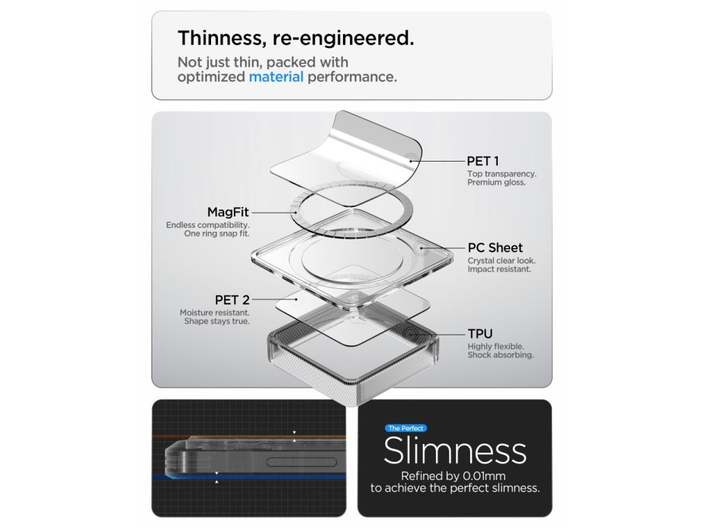 Přesné výřezy umožňují snadný přístup ke všem portům, reproduktorům a nabíjecímu portu. Tenký profil minimalizuje objem telefonu a zároveň zachovává jeho praktický tvar. Instalace a demontáž je rychlá a snadná díky flexibilnímu designu rámu.