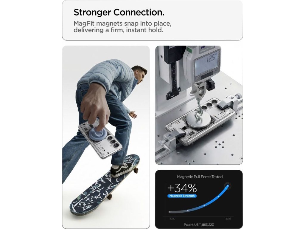 Vestavěný magnetický kroužek kompatibilní s MagSafe umožňuje pohodlné bezdrátové nabíjení i používání magnetického příslušenství bez nutnosti sundávat kryt. Bez problémů tak můžete používat MagSafe nabíječky, držáky, peněženky, powerbanky i další doplňky.