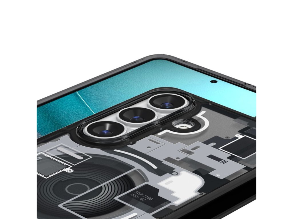 Pouzdro kombinuje flexibilní TPU rám s pevnými polykarbonátovými zády a vytváří tak hybridní design, který poskytuje komplexní ochranu. Měkký rám absorbuje nárazy a otřesy během každodenního používání, zatímco tvrdá záda chrání před poškrábáním a mechanickým poškozením. Zesílené rohy s technologií Air Cushion dále absorbují energii pádů a minimalizují tak riziko poškození zařízení. Zvýšené okraje kolem obrazovky a fotoaparátu chrání nejcitlivější prvky před přímým kontaktem s povrchem.