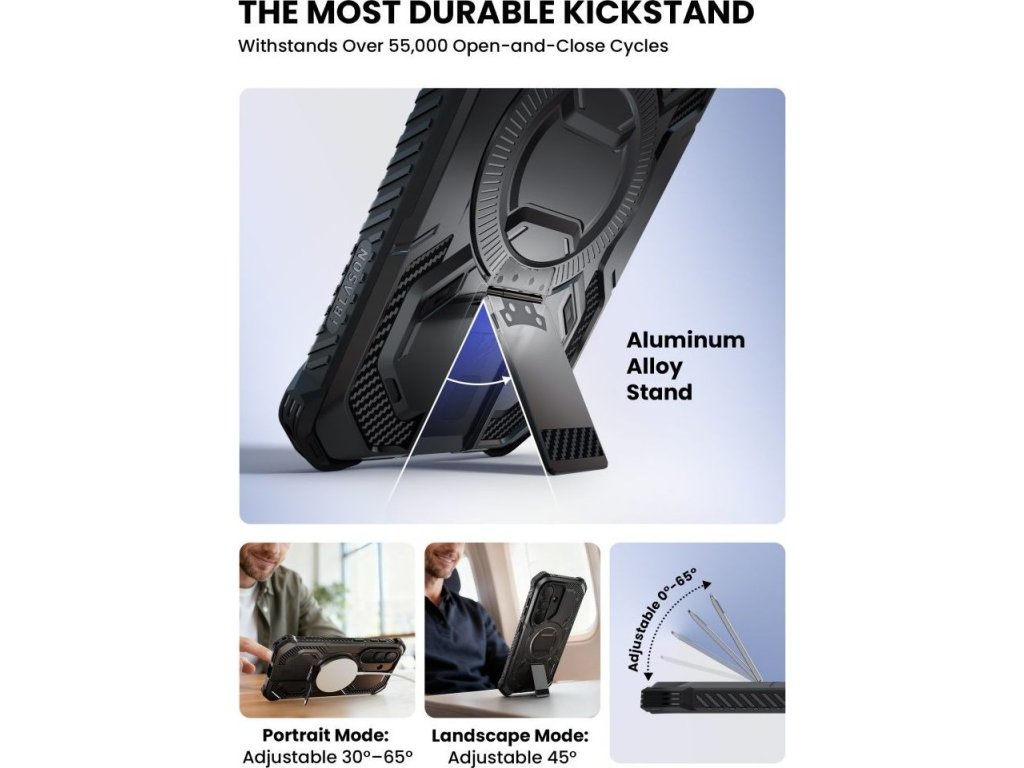Součástí krytu je vestavěný stojánek, který umožňuje pohodlné sledování videí, videohovory nebo práci s telefonem bez nutnosti jej držet v ruce. Stojánek lze využít v režimu na šířku i na výšku, což zvyšuje univerzálnost celého krytu.