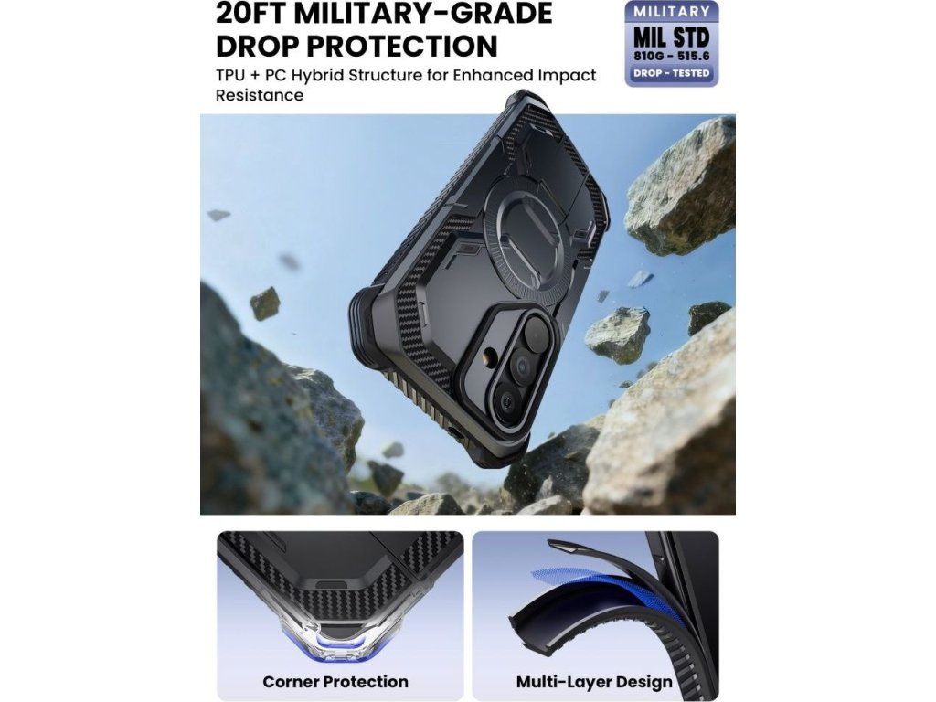 Kryt splňuje vojenský standard Mil-Grade, což znamená zvýšenou odolnost vůči pádům a mechanickému poškození. Robustní konstrukce je navržena tak, aby pomáhala rozkládat energii při dopadu a chránila zařízení i při náročnějším používání.