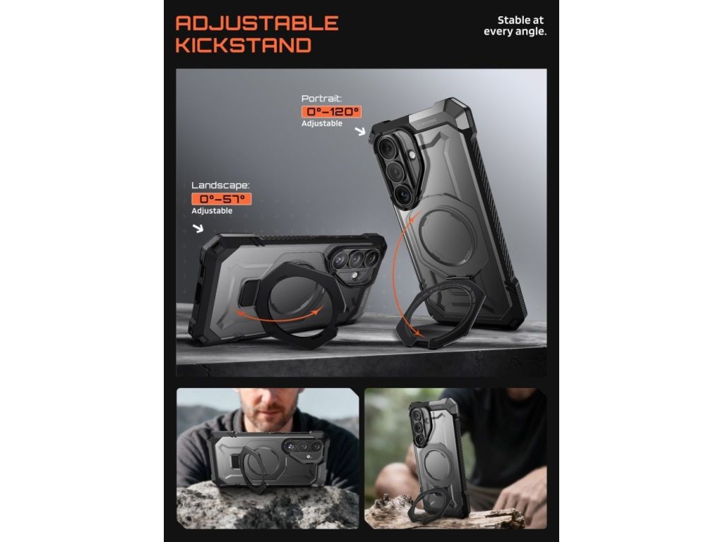 Vestavěný magnetický kroužek zajišťuje plnou kompatibilitu s technologií MagSafe, což umožňuje rychlé bezdrátové nabíjení a stabilní uchycení k magnetickému příslušenství. Kroužek slouží také jako stojánek a úchop, což zvyšuje pohodlí při sledování obsahu nebo videohovorech. Vojensky inspirovaný styl dodává zařízení moderní a dynamický vzhled a zároveň zdůrazňuje jeho robustní povahu.