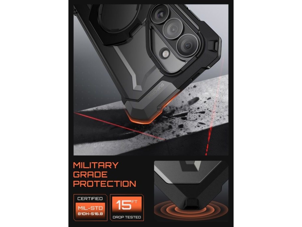 Pouzdro Supcase UB Grip Mag MagSafe je pokročilé pancéřované pouzdro, které kombinuje extrémní ochranu s funkcí MagSafe. Vyrobeno z kombinace termopolyuretanu (TPU) absorbujícího nárazy a pevného polykarbonátu (PC) se zesílenými rohy, splňuje vojenské standardy Mil-Grade a poskytuje maximální ochranu při pádu. Lehká kompozitní konstrukce snižuje objem telefonu a zároveň zachovává naprostou stabilitu a bezpečnost.