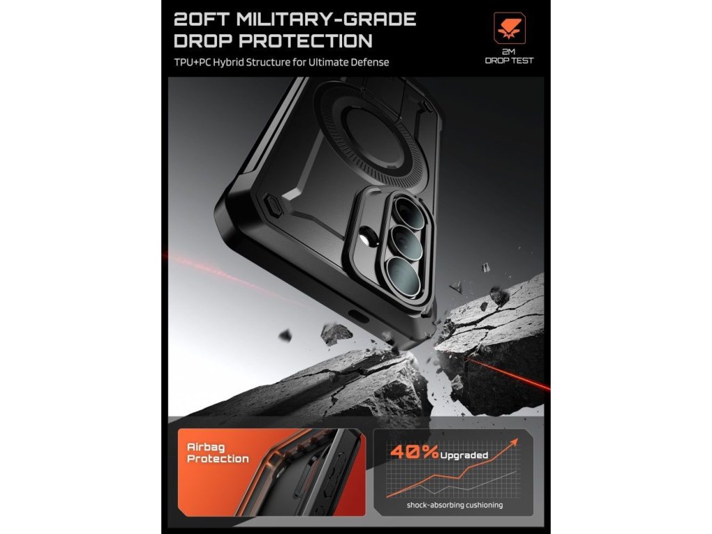 Pouzdro splňuje vojenský standard Mil-Grade, což znamená zvýšenou odolnost při pádech a nárazech. Díky robustní konstrukci pomáhá lépe rozkládat energii při dopadu a chrání nejcitlivější části telefonu při každodenním používání.