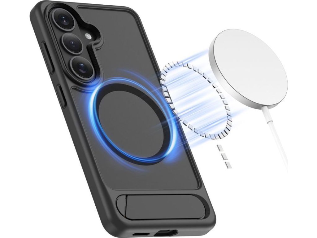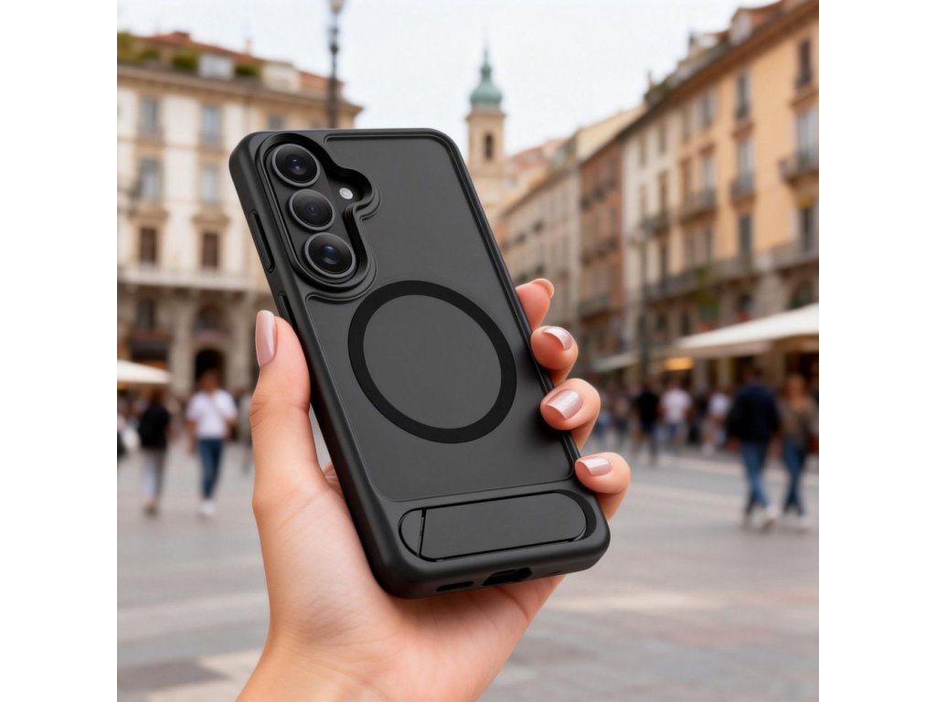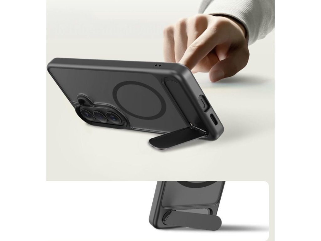 Vestavěný výsuvný stojánek umožňuje pohodlné umístění telefonu vodorovně i svisle, což je ideální pro sledování filmů, videohovory nebo prohlížení obsahu. Robustní konstrukce stojánku zajišťuje stabilitu a po použití se snadno složí do zadní části pouzdra, aniž by zvětšoval jeho objem. Vestavěný magnetický kroužek MagSafe zajišťuje plnou kompatibilitu s příslušenstvím MagSafe a umožňuje bezdrátové nabíjení bez nutnosti sundávání pouzdra.