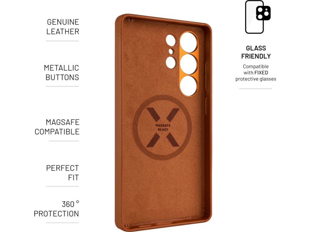 Zadní kryt FIXED MagLeather s podporou funkce MagSafe, vyrobený z pravé kůže pro dokonalou ochranu vašeho chytrého telefonu. Pouzdro zaujme na první pohled elegantním vzhledem barevné kůže v kombinaci s metalickými krytky tlačítek a lemováním okraje výřezu na fotoaparát. Časem každý kryt získá jedinečnou a originální patinu a zraje tak jako víno. Díky integrovaným magnetům v zadní části kryt MagLeather perfektně spolupracuje s veškerým MagSafe příslušenstvím. Vnitřní strana krytu je tvořena jemnou vystýlkou z mikrovlákna pro dokonalé bezpečí vloženého telefonu. FIXED MagLeather je navržen přesně na míru danému modelu telefonu, dokonale sedí a dobře se drží v ruce.